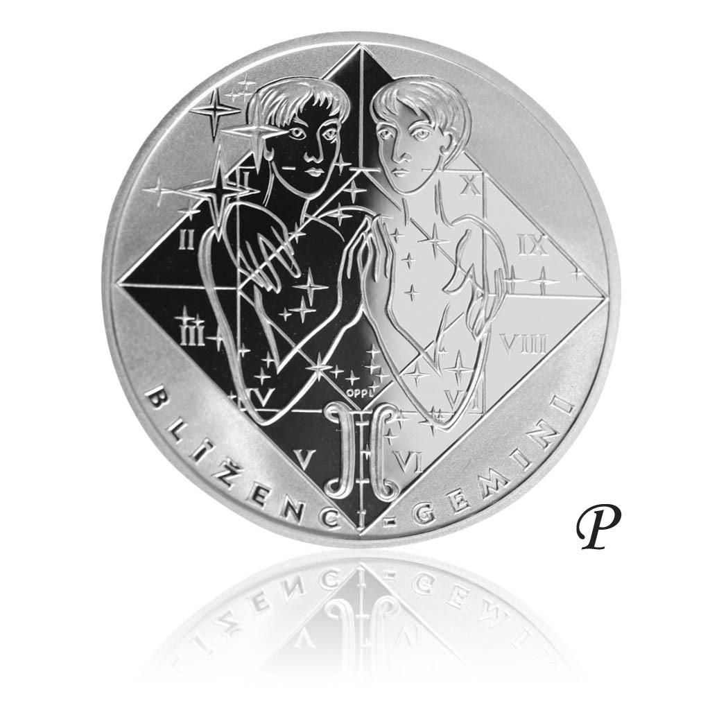 Blíženci, latinsky Gemini, 22. května až 21. června. Vzdušné znamení s vedoucí planetou Merkur. Šťastným kovem je rtuť, rostlinou bezinka a dnem úterý. Na straně s jednotlivými znameními umístěnými v leštěném kosočtverci používaném astrology je umístěno nejen znamení, ale i jeho značka, český a latinský nápis. Hvězdičky svým rozestavením odpovídají příslušnému souhvězdí na obloze. Na averzní straně se nachází kompozice s motivem blíženců, doplněna jejich souhvězdím. Na reverzní stranu s dekorem po obvodu je možno vygravírovat věnování nebo přenést fotografii.
