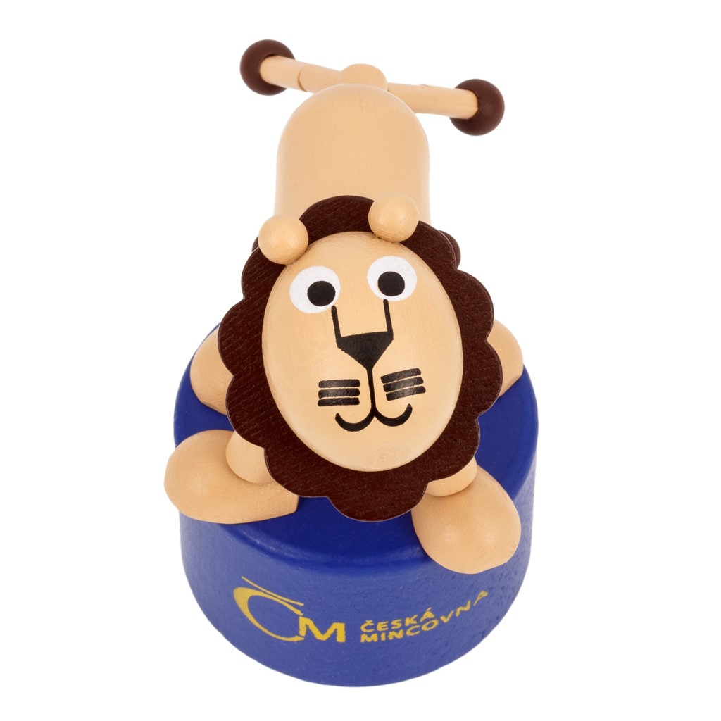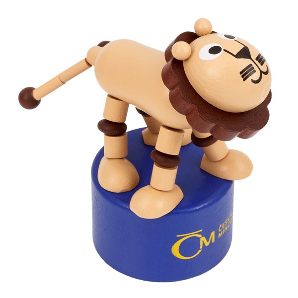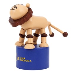 Taková je i hračka v podobě dvouocasého českého lva, která spadá do tradiční kategorie takzvaných „mačkacích figurek“. Jednotlivé dřevěné dílky, ze kterých je lev poskládán, jsou propojeny vlascem a v podstavci hračky je ukryté tlačítko. Podle toho, kde a jak silně tlačítko zmáčknete, se pak figurka pohybuje a můžete si s ní hrát jako s jednoduchou loutkou.