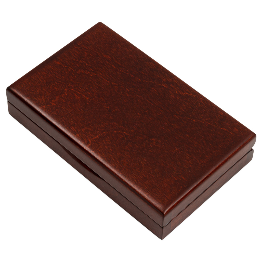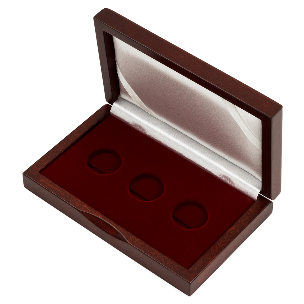 Krabička s odklápěcím víčkem, která je vyrobena z tmavého dřeva, pojme 3 kusy zlatých mincí nebo medailí v kapsli o průměru 24,25 mm.