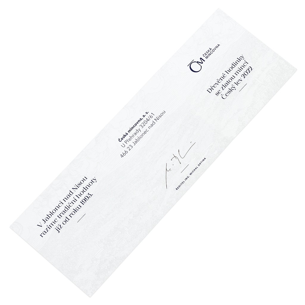 Vlastenecký design hodinek předkládá dvě heraldická zvířata České republiky. Do ciferníku s vypáleným motivem orlice, která je syntézou svatováclavského, moravského a slezského dravce, je zasazena zlatá investiční mince Český lev o hmotnosti 1/25 trojské unce s motivem z roku 2022. Spolutvůrcem designu hodinek se stal Asamat Baltaev, DiS., který je autorem reliéfu mince.
