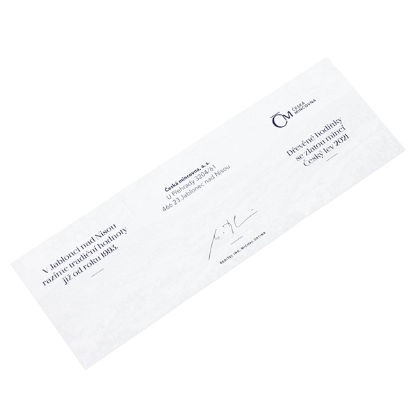 Vlastenecký design hodinek předkládá dvě heraldická zvířata České republiky. Do ciferníku s vypáleným motivem orlice, která je syntézou svatováclavského, moravského a slezského dravce, je zasazena zlatá investiční mince Český lev o hmotnosti 1/25 trojské unce. Spolutvůrcem designu hodinek se stal Asamat Baltaev, DiS., který je autorem reliéfu mince.