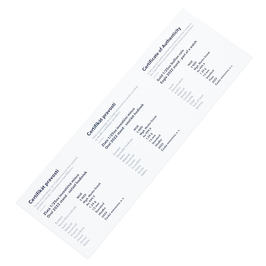 Do střízlivého ciferníku je zasazena zlatá investiční mince Orel o hmotnosti 1/25 trojské unce s motivem z roku 2022, která je dílem medailéra MgA. Martina Daška.