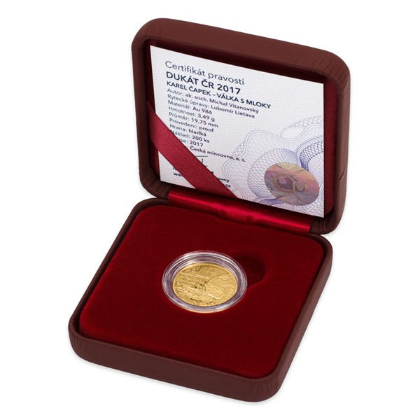 Zlatý dukát je nejmenší emisí Dukátové řady. Ta je v roce 2017 zasvěcena uměleckým dílům první republiky, jejíž literární proud představují Karel Čapek a jeho románová Válka s mloky.