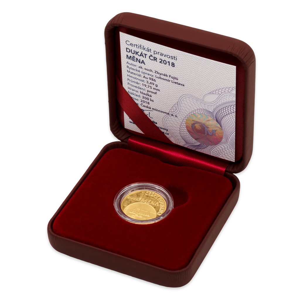 Motivem tradičních dukátů České republiky byly v roce 2018, kdy jsme oslavili 25. výročí vzniku samostatné České republiky, atributy, které náš suverénní stát definují a reprezentují uvnitř i navenek. Nejmenší zlatá dukátová ražba – 1 dukát – je věnována české měně.