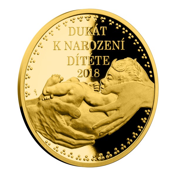Výtvarné podoby averzní strany dukátu pro rok 2018 se ujala talentovaná medailérka Lenka Nebeská, DiS. Zvolila motiv spícího miminka, které drží v dlaních jeho rodiče, a doplnila ho nápisem DUKÁT K NAROZENÍ DÍTĚTE 2018. Reverzní strana je ovinuta stužkou ve tvaru srdce, která vymezuje prostor pro vyrytí textu. Ten může mít podobu osobního vzkazu, jména, data narození, … – fantazii se meze nekladou. Jediným limitem je rozsah textu: 3 řádky po 10 znacích včetně mezer.