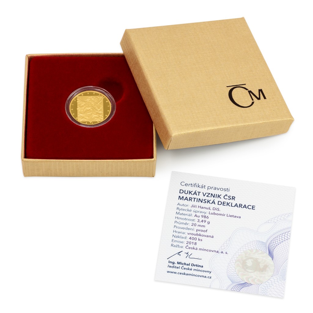 Minisérie České mincovny „Vznik Československa“, která připomíná stěžejní okamžiky vedoucí k naší samostatnosti, se po Washingtonu a Praze vydává na Slovensko. Čtvrtý z pěti zlatých dukátů je totiž věnován Martinské deklaraci.