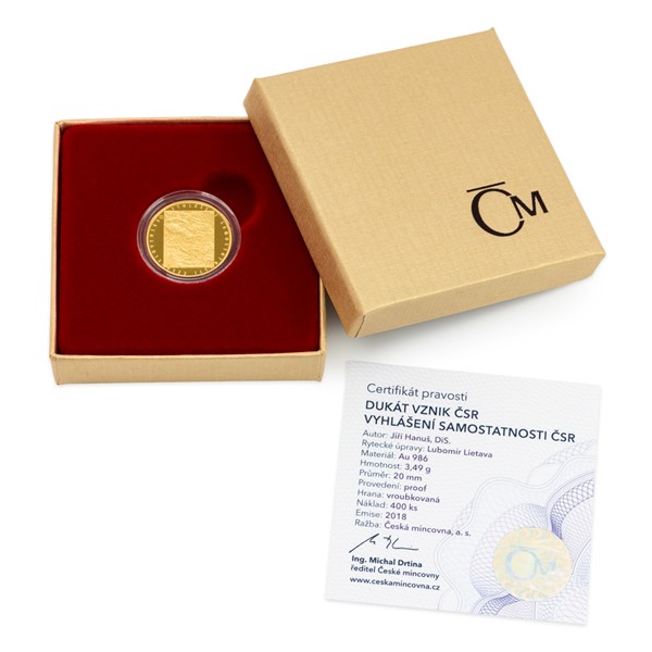 Pětidílnou minisérii České mincovny „Vznik Československa“, která popisuje události roku 1918 spojené se založením společného státu Čechů a Slováků, zahájila Washingtonská deklarace. Toto prohlášení nezávislosti vzniklo a bylo představeno v zahraničí, ale živo bylo i na domácí půdě. Druhý zlatý dukát připomíná vyhlášení samostatnosti Československa.