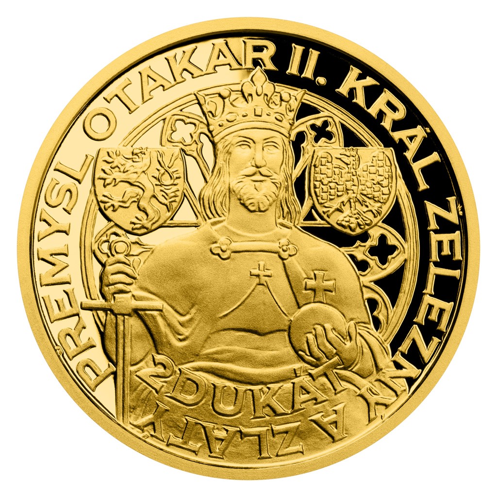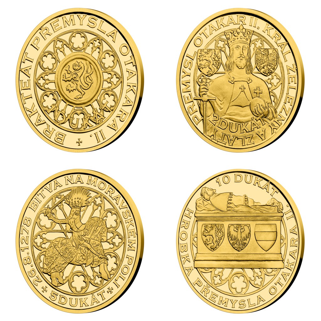 Averzní strany jednotlivých dukátových ražeb připomínají život a smrt Přemysla Otakara II. Dukát zdobí králova mince – brakteát, na kterém se poprvé objevil dvouocasý český lev. Dvoudukát nese králův portrét – polopostavu inspirovanou sochou na Prašné bráně. Na pětidukátu najdete krále, který se chystá do bitvy – rytíře na koni převzatého z Gelnhausenova kodexu. Desetidukát předkládá královu tumbu – zdobenou hrobku. Doplňkovým motivem je ve všech případech rozeta z kláštera Zlatá Koruna, který král založil. Reverzní strana, jež je společná všem čtyřem ražbám Dukátové řady, pak předkládá panovníkovy relikvie. Jeho lebku, která byla rozťata v bitvě na Moravském poli, pohřební korunu a latinský opis převzatý z tohoto klenotu – HIC SUNT OSSA OTACARI INCLITI REGIS BOHEMIE QUINTI (zde jsou kosti Otakara, slavného pátého českého krále). To vše je dílem medailéra Mgr. Petra Horáka.