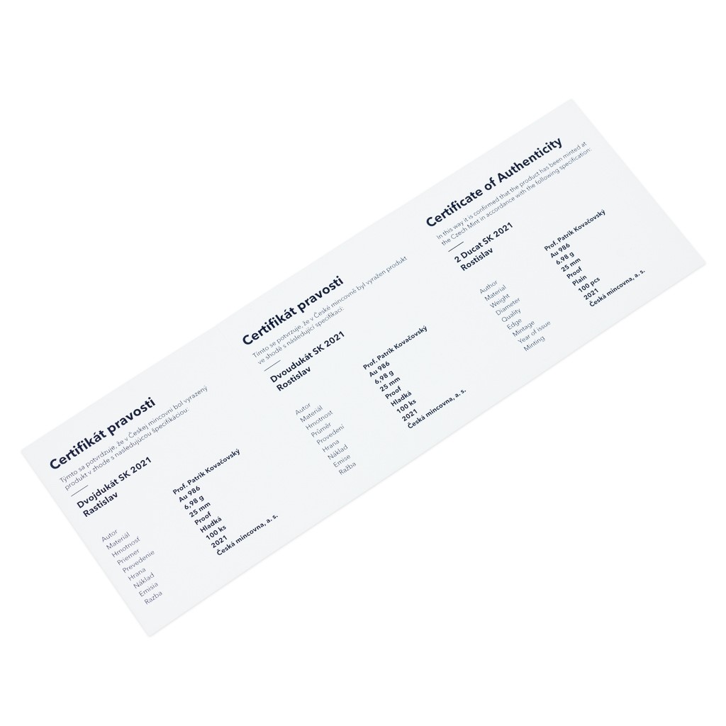 Příběhy Velké Moravy – takové je v roce 2021 téma první Dukátové řady České mincovny, která vznikla pro slovenské sběratele a investory. Nejznámější z velkomoravských příběhu je spojen s osobností knížete Rostislava, který se objevuje na zlatém dvoudukátu.