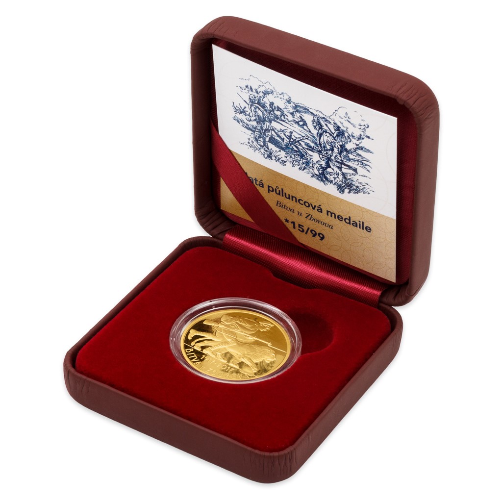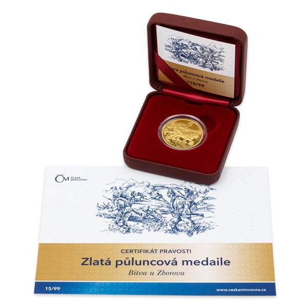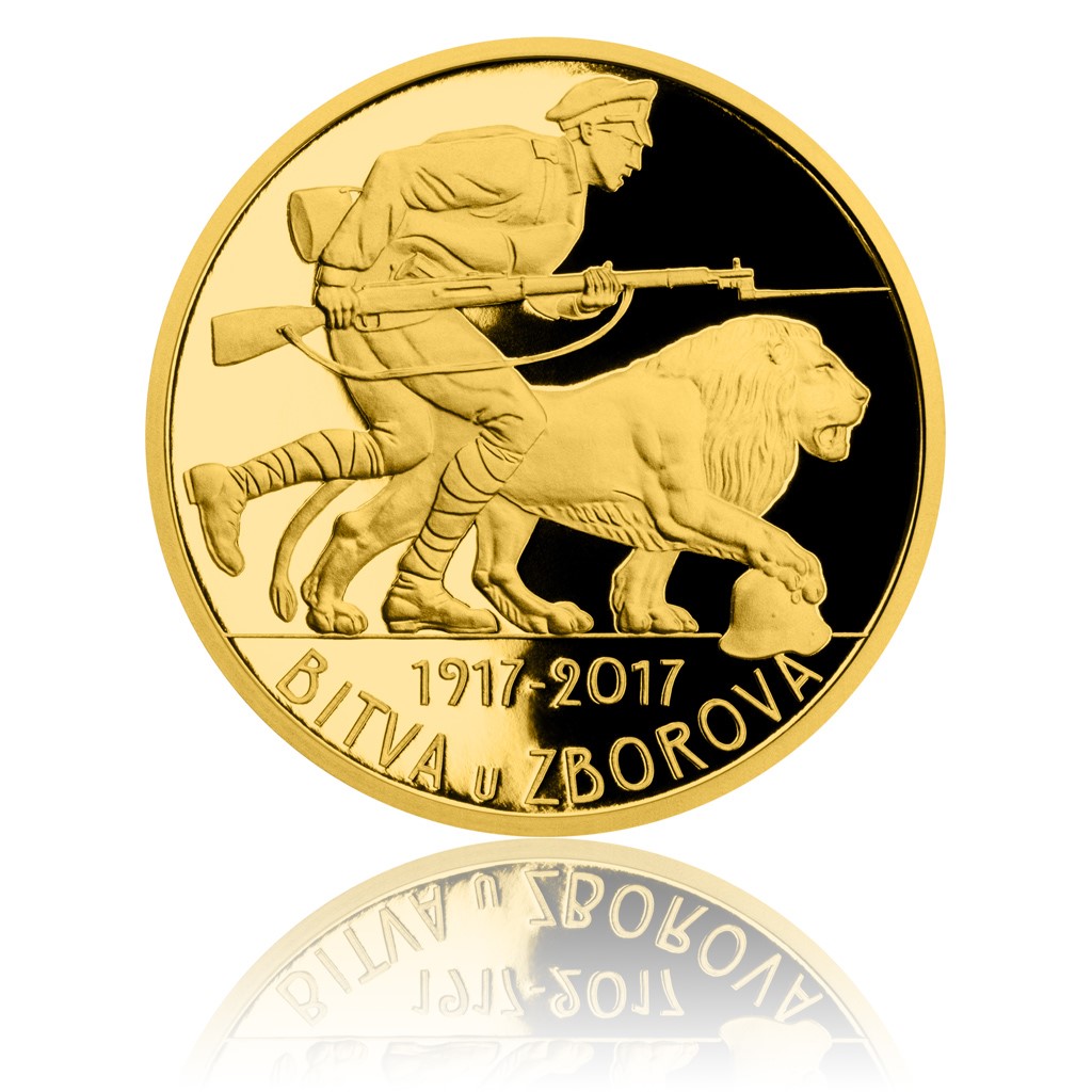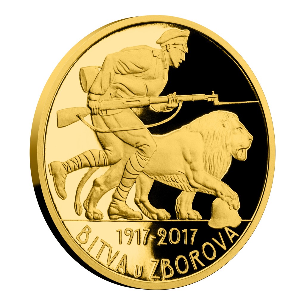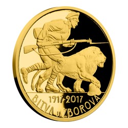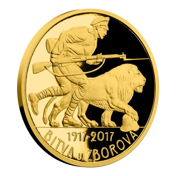 The gold medal of the experienced medal maker Luboš Charvat is part of a free cycle from the Czech Mint, which represents the most beautiful unrealized designs submitted to a competition by the Czech National Bank. ”I pictured one soldier, one Symbol of Czechoslovakia on the obverse side of the coin," says the author. The attacking soldier is accompanied by the czech lion with one paw placed on an austrian military helmet. Inscriptions are BATTLE AT ZBOROV, 1917-2017.