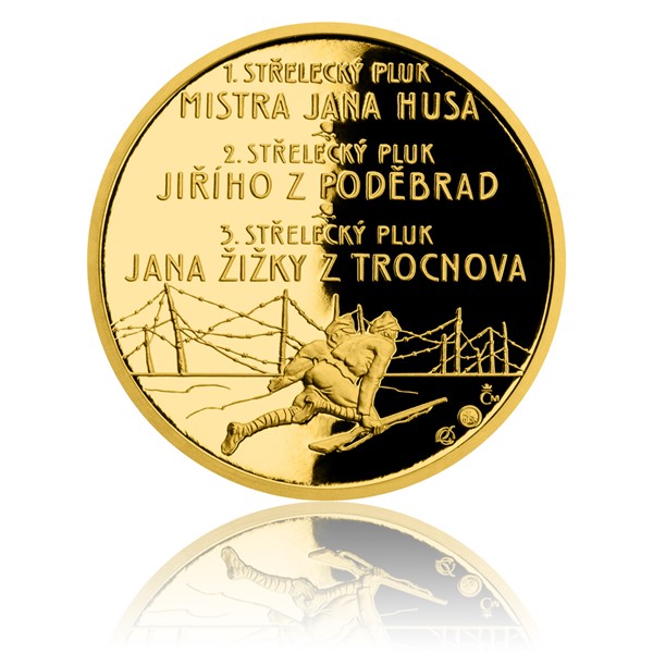 The reverse side belongs to the soldiers attacking the buried Austrian position. The scene is supplemented by the names of the Czechoslovakian shooting regiment JAN HUS, GEORGE FROM PODĚBRADY and JAN ŽÍŽKA FROM TROCNOV.
