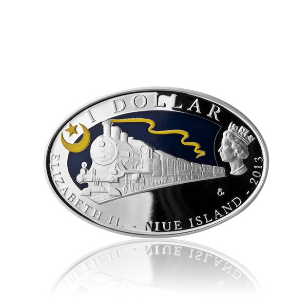 The obverse side of the coin depicts Orient Express on the background of landscape at night, a Turkish half-moon and the obligatory requisites: the effigy of Queen Elizabeth, the face value of the coin – 1 NZD, the name of the country Niue Island and the year of issue.