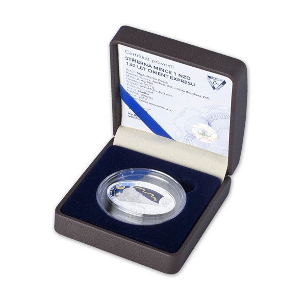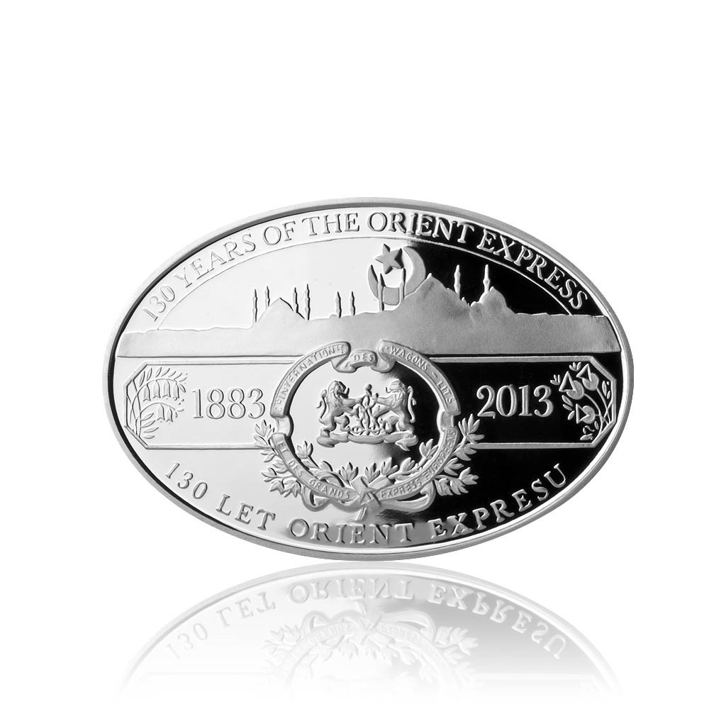 The reverse side features a silhouette of Istanbul lit by the Turkish half-moon, with two motives from the decoration of Orient Express coaches placed below – an art-nouveau decorative painting and the train’s embossed logo with years 1883 and 2013. The text in circumscription in two languages reads "130 let Orient Expresu", "130 years of the Orient Express".