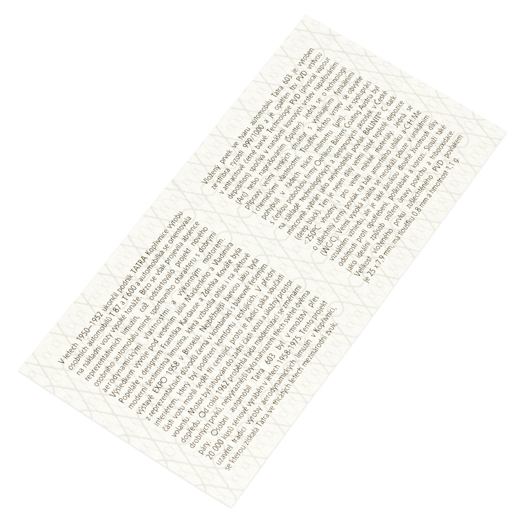 The author of the commemorative coin is the medal maker Petra Brodská, DiS. The expert committee of the Czech National Bank was particularly impressed by the “excellent rendering of the Tatra 603 car together with its detailed elements, including technical drawings“. The car is depicted in the first series with three headlights. The reverse side of the coin features an inlay in the shape of a car, which is made of pure silver and has a special surface finish of anthracite colour. The so-called PVD technology involves applying metal layers by steaming or sputtering. It can be used to create very thin structures with excellent physical and chemical properties. Their thickness is in the order of mere thousandths of a millimetre. The noble coating based on amorphous carbon simulates the iconic black paint of the Tatra 603, while providing the coin with additional protection against wear and corrosion.