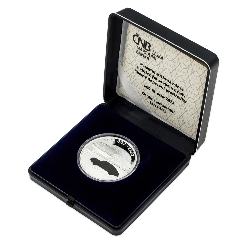 The five-year cycle of silver coins of the Czech National Bank with a nominal value of 500 CZK, which commemorates famous means of transport, presents its third issue. The coin with the year 2023 was minted in quality proof and dedicated to the Tatra 603 passenger car.