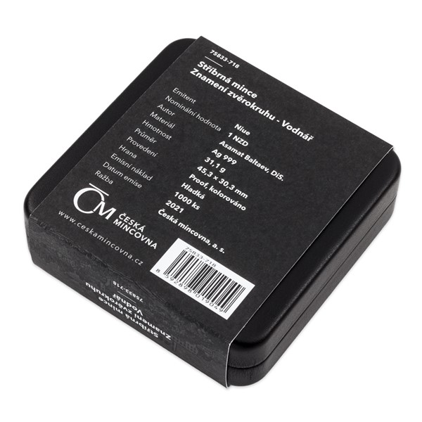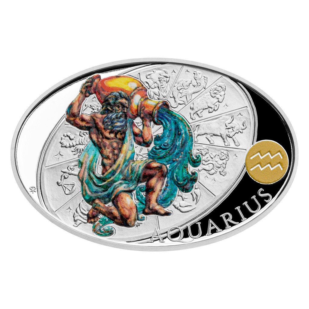 he coin of a non-traditional oval shape bears a colored image of Aquarius in the form of an ancient man with an amphora on the reverse side. Photographs or computer graphics were not used as a template for coloring - the author of the coin, Asamat Baltaev, DiS., created an original watercolor painting. The relief in the background behind Aquarius presents a disk with a dozen zodiac signs. The composition of the reverse side is supplemented with a Latin inscription of AQUARIUS and an astrological symbol. Since the coins of the Czech Mint are licensed by a foreign issuer, the island of Niue, their obverse sides bear its national emblem, the nominal value of ONE DOLLAR (NZD) and the year of issue 2021. All this is surrounded by twelve astrological signs.