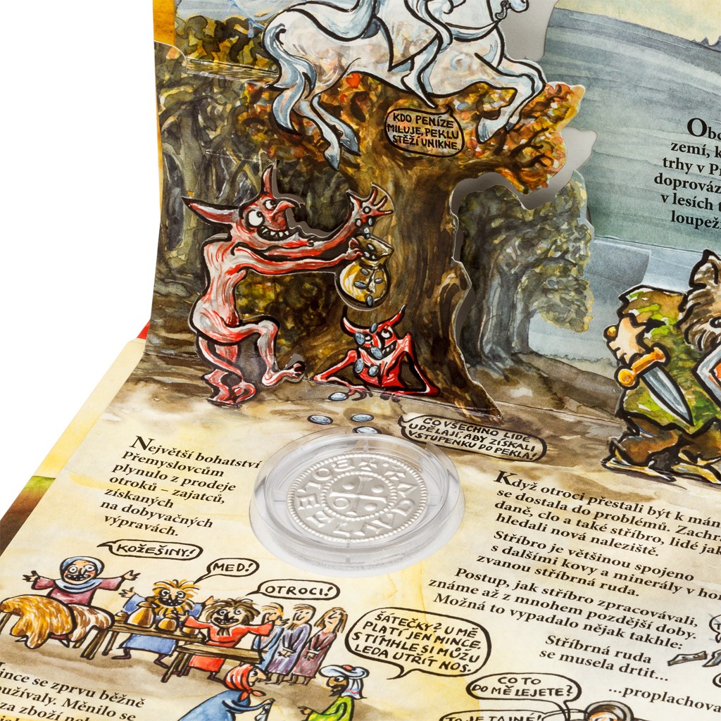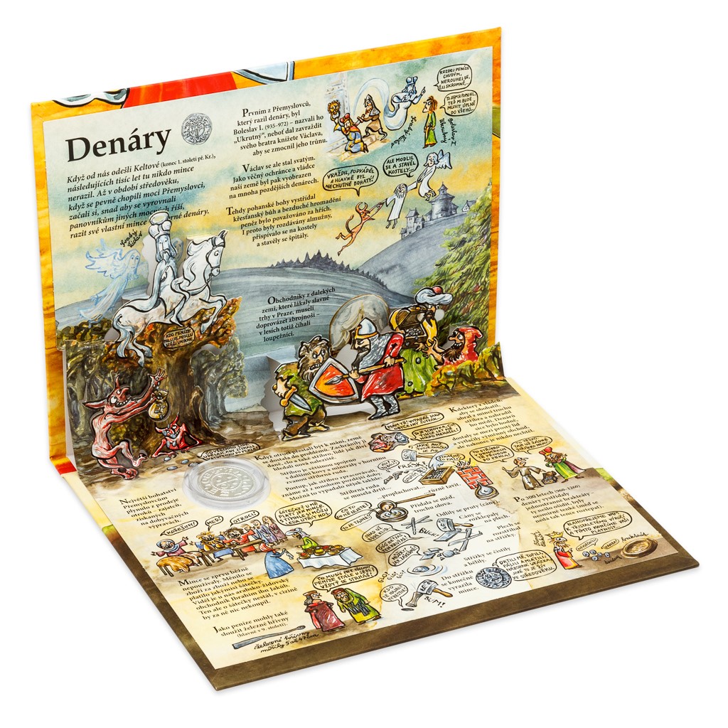 Replika je vsazena do ilustrovaného prostorového leporela. V nezaměnitelném podání Lucie Seifertové se dozvíte řadu zajímavostí o životě a mincovnictví ve středověkém světě. Kompletní sedmidílný cyklus replik historických mincí si pak můžete uložit do atraktivního sběratelského boxu. Emisní náklad jednotlivých replik není limitován.