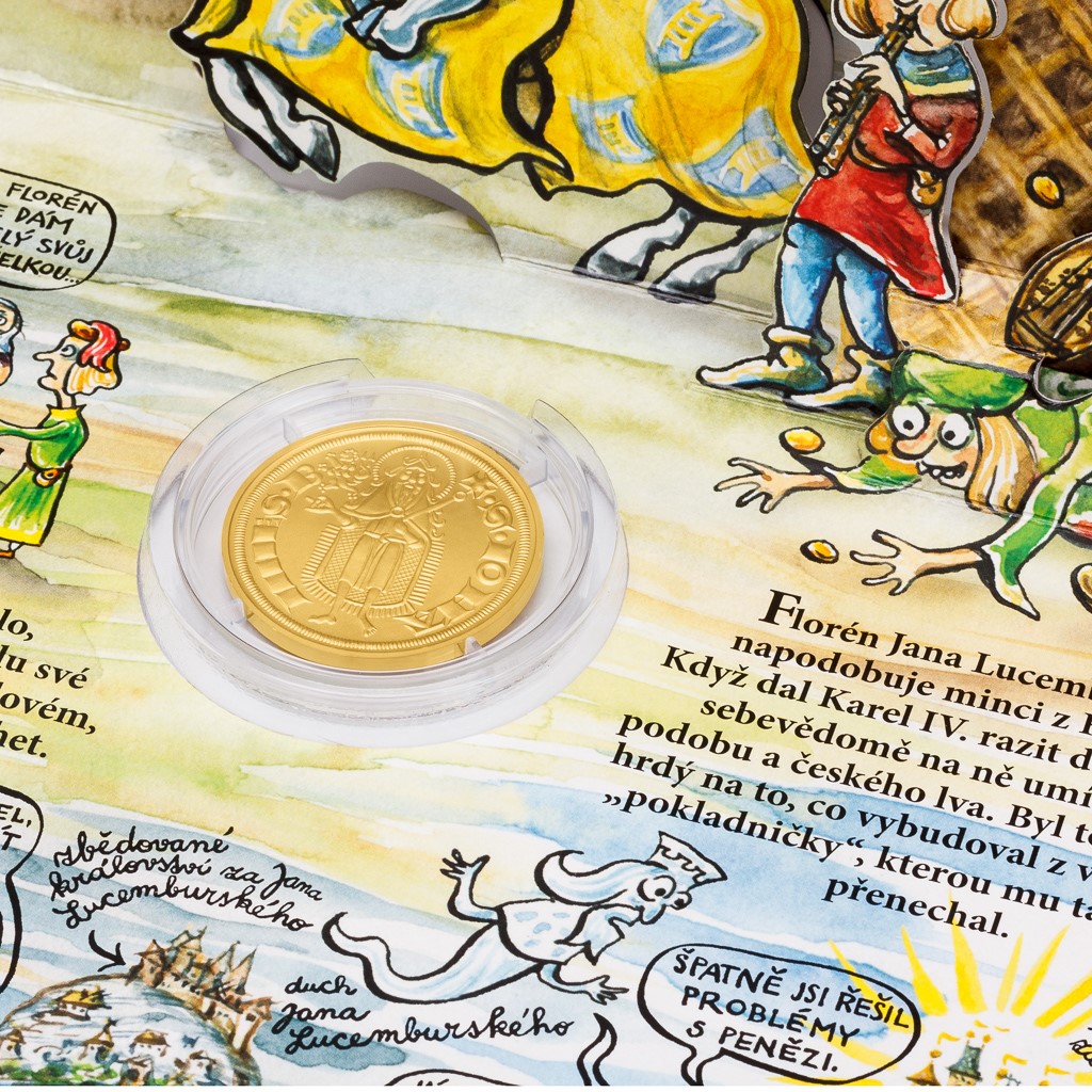 Když rukou vraha skončila vláda Přemyslovců, nastala tahanice o český trůn, kterou vyhrál rod Lucemburků. Král Jan Lucemburský se po celé Evropě proslavil jako ten nejskvělejší ze všech rytířů. Správný rytíř musel být udatný, šlechetný a také nesměl šetřit penězi. V tom byl Jan skutečným přeborníkem. Z kutnohorských dolů měl spoustu stříbrných grošů, ale to mu bylo málo. Potřeboval oslnit zlatem, a tak dal razit první českou zlatou minci – florén… Mince moc česky nevypadala. Razila se totiž po vzoru známých a zavedených mincí z Florencie, a nesla proto lilii a svatého Jana Křtitele – čili znak a patrona italského města. Jan Lucemburský k těmto symbolům přidal jenom své jméno a malinkého českého lva… Florény nebyly určeny k běžným obchodům někde na tržišti – tam se platilo stříbrnými mincemi. Sloužily k mezinárodním obchodům a k reprezentaci – zkrátka k tomu, aby všichni ve světě viděli, jak je český král bohatý… I když byly české florény brzy nahrazeny slavnějšími zlatými dukáty, jejich historické prvenství jim nikdo nevezme.