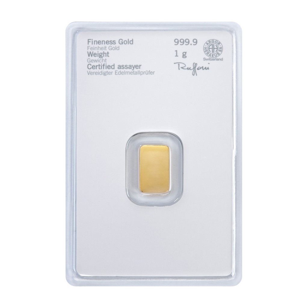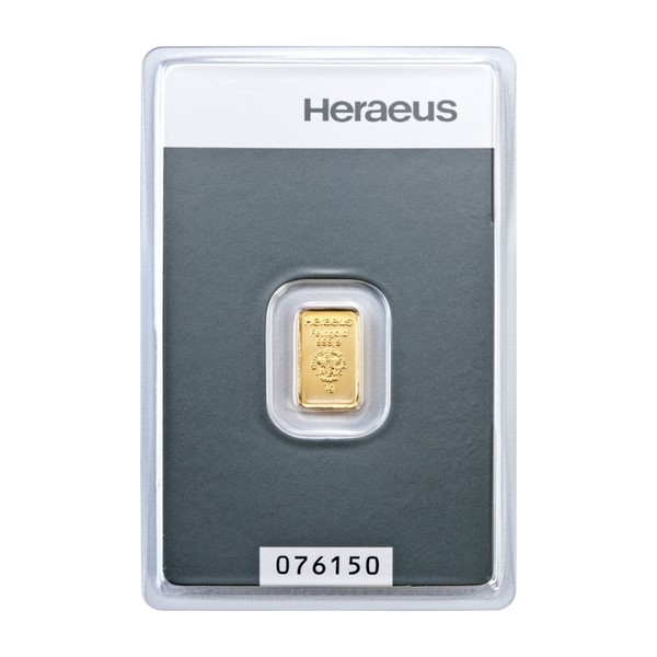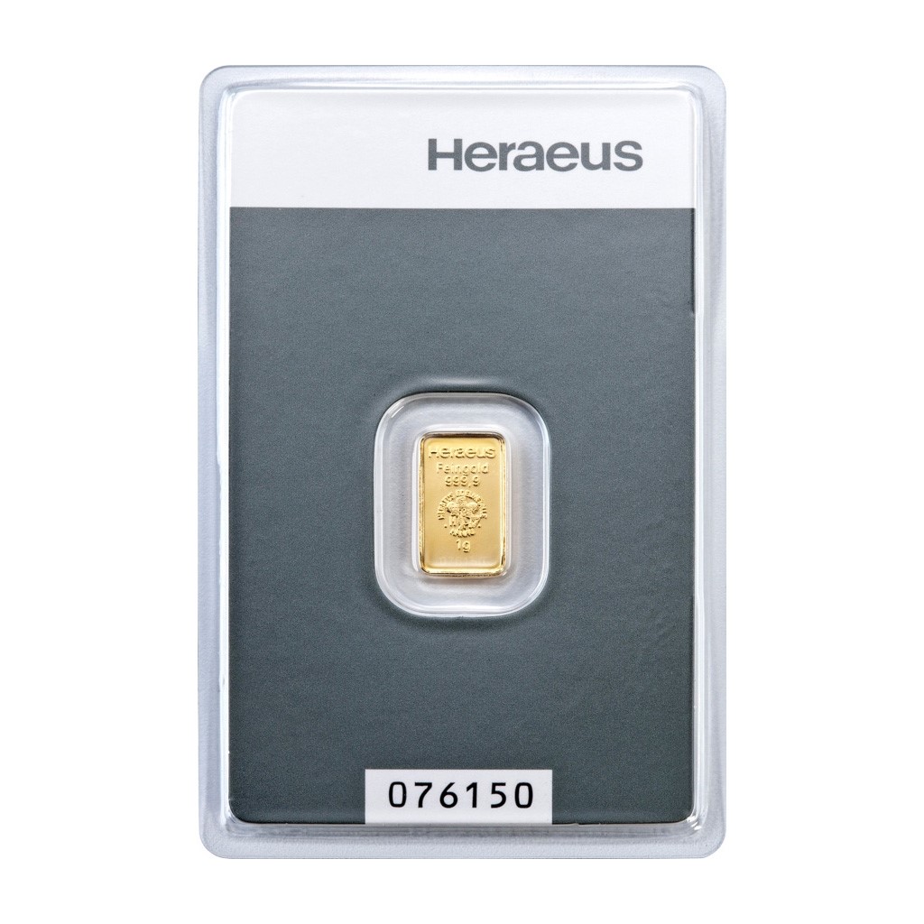 Investiční zlato o hmotnosti 1 g. Na každé investiční cihle nebo slitku jsou vyraženy údaje – logo vydavatele Heraeus, hmotnost, ryzost kovu, pečeť kvality a výrobní číslo. Cihlička je číslovaná. Slitky o hmotnosti od 1g do 100g jsou ražené a společně s certifikátem jsou zataveny v ochranné fólii. Tato folie s certifikátem nesmí být porušena.