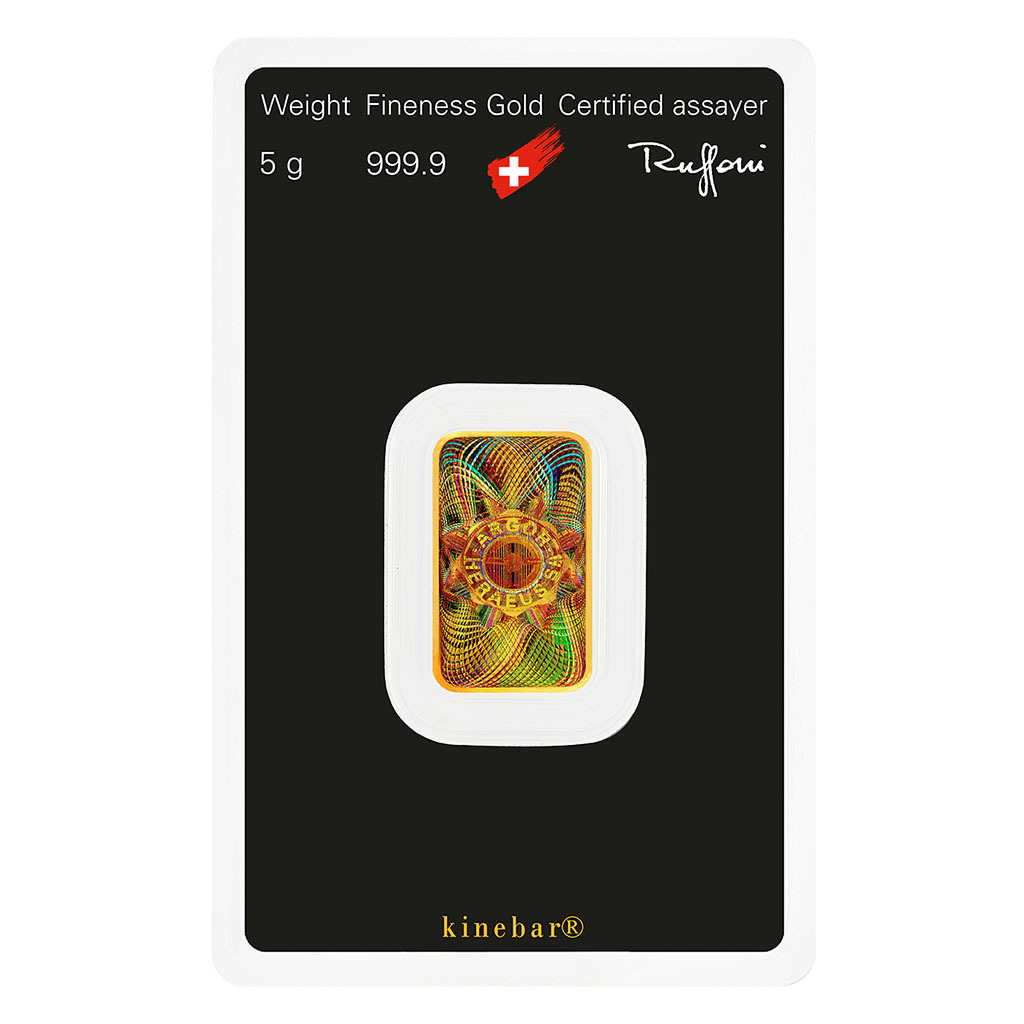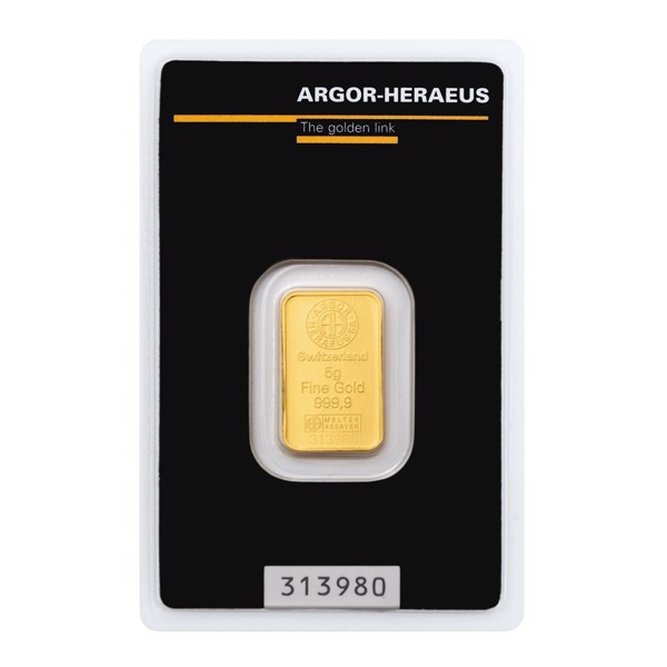 Na pětigramové zlaté cihličce najdete vyražené logo firmy Argor-Heraeus, údaj o hmotnosti a ryzosti a pečeť kvality Švýcarského centrálního úřadu pro kontrolu drahých kovů. Tato cihlička je číslovaná.