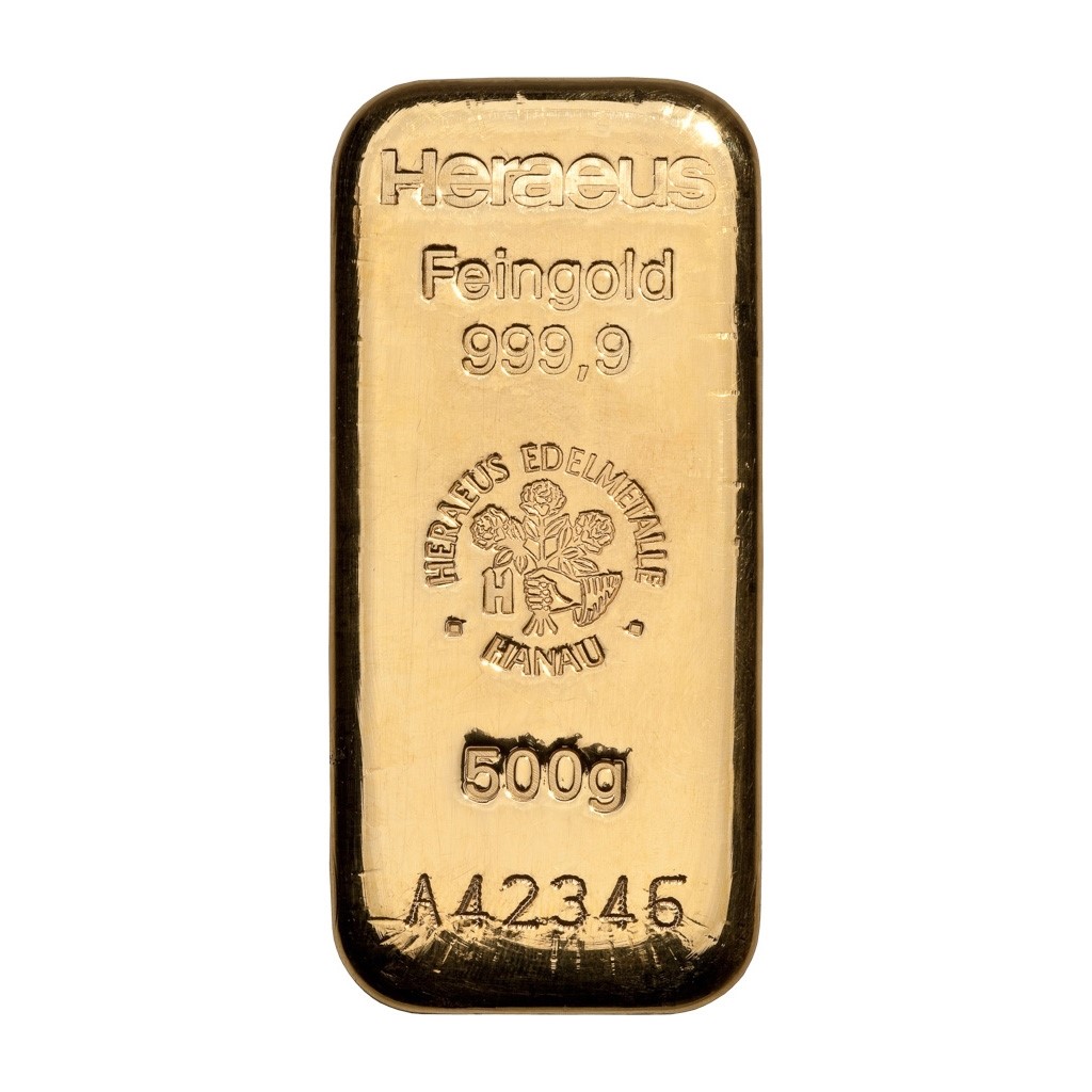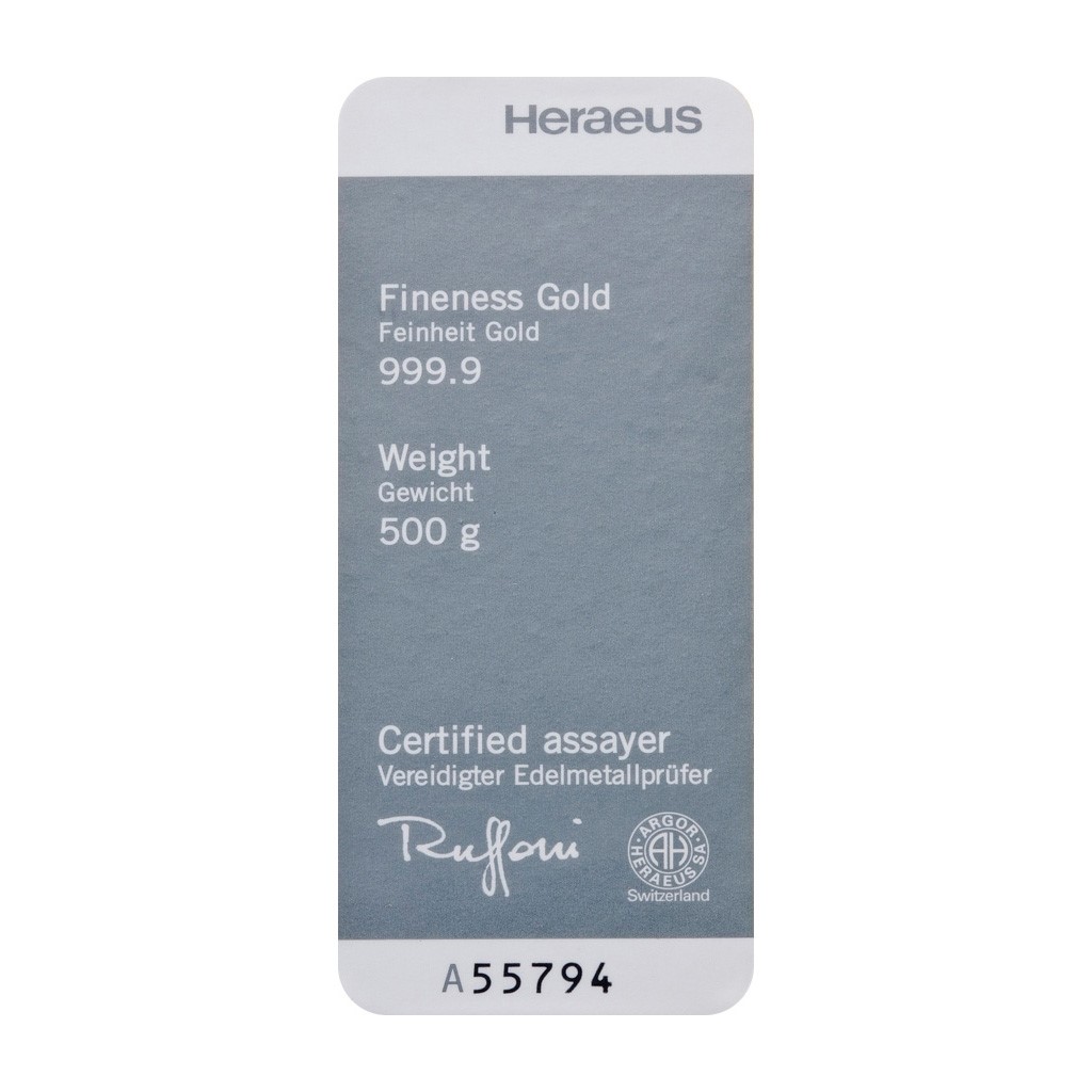 Investiční zlato o hmotnosti 500 g. Na každé investiční cihle nebo slitku jsou vyraženy údaje – logo vydavatele Heraeus, hmotnost, ryzost kovu, pečeť kvality a výrobní číslo. Cihlička je číslovaná.
