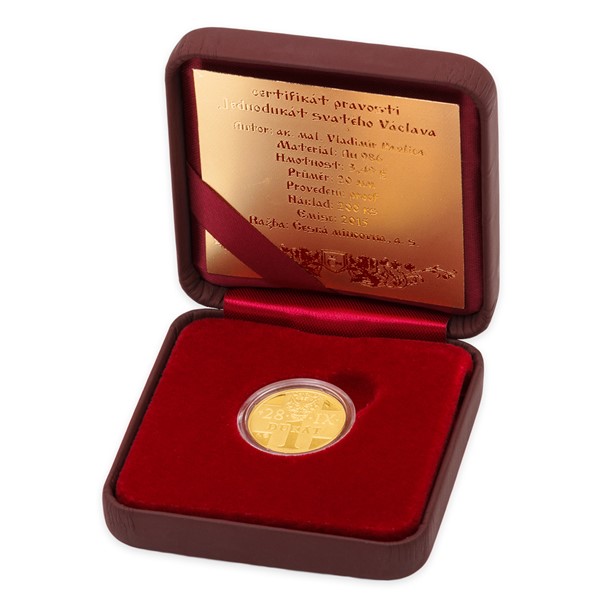 Tato luxusní edice jednodukátu svatého Václava je doplněna nevšedním certifikátem původu, který nese plastický text s okrasným reliéfem dvou českých lvů držících štít České mincovny a který pokrývá vrstva 24karátového zlata! Světlo světa spatří pouhých 200 kusů!