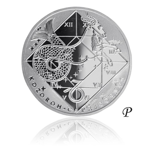 Kozoroh, latinsky Capricorn, 22. prosince až 20. ledna. Zemské znamení s vedoucí planetou Saturn. Šťastným kovem je olovo, květinou sedmikráska a dnem pondělí. Na straně s jednotlivými znameními umístěnými v leštěném kosočtverci používaném astrology je umístěno nejen znamení, ale i jeho značka, český a latinský nápis. Hvězdičky svým rozestavením odpovídají příslušnému souhvězdí na obloze. Na averzní straně se nachází kompozice s motivem býka, doplněna jeho souhvězdím. Na reverzní stranu s dekorem po obvodu je možno vygravírovat věnování nebo přenést fotografii.