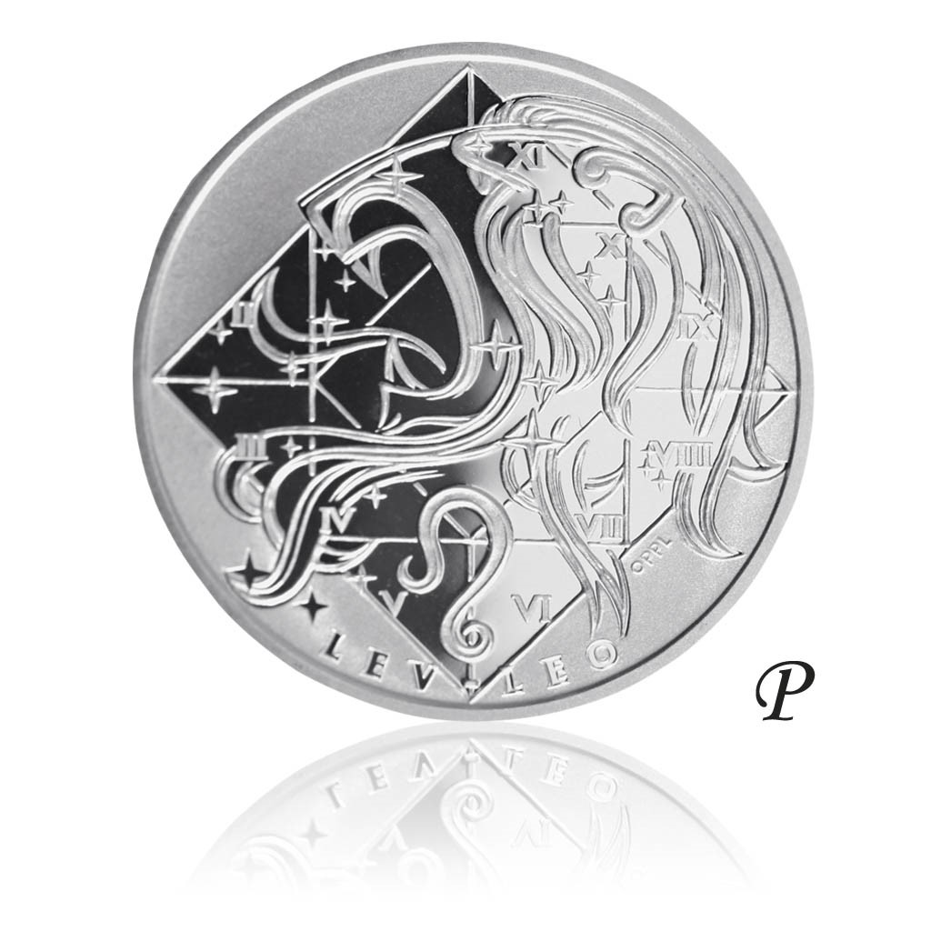 Lev, latinsky Leo, 23. července až 22. srpna. Zlaté znamení s vedoucí planetou Slunce. Šťastným kovem je zlato, květinou kopretina a dnem neděle. Na straně s jednotlivými znameními umístěnými v leštěném kosočtverci používaném astrology je umístěno nejen znamení, ale i jeho značka, český a latinský nápis. Hvězdičky svým rozestavením odpovídají příslušnému souhvězdí na obloze. Na averzní straně se nachází kompozice s motivem lva, doplněna jeho souhvězdím. Na reverzní stranu s dekorem po obvodu je možno vygravírovat věnování nebo přenést fotografii.