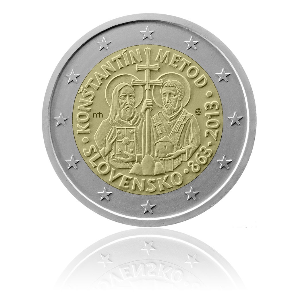 Pamětní mince v nominální hodnotě 2 EUR k 1150. výročí příchodu mise Konstantina a Metoděje na Velkou Moravu, kterou vydává Národní banka Slovenska. Autorem návrhu mince je výtvarník Miroslav Hric. Konstantin a Metoděj významně přispěli k položení základů evropské civilizace a v roce 1980 byli oba světci prohlášeni za spolupatrony Evropy.