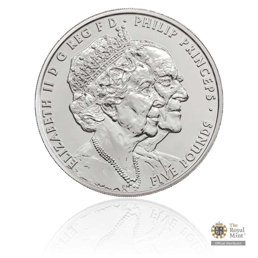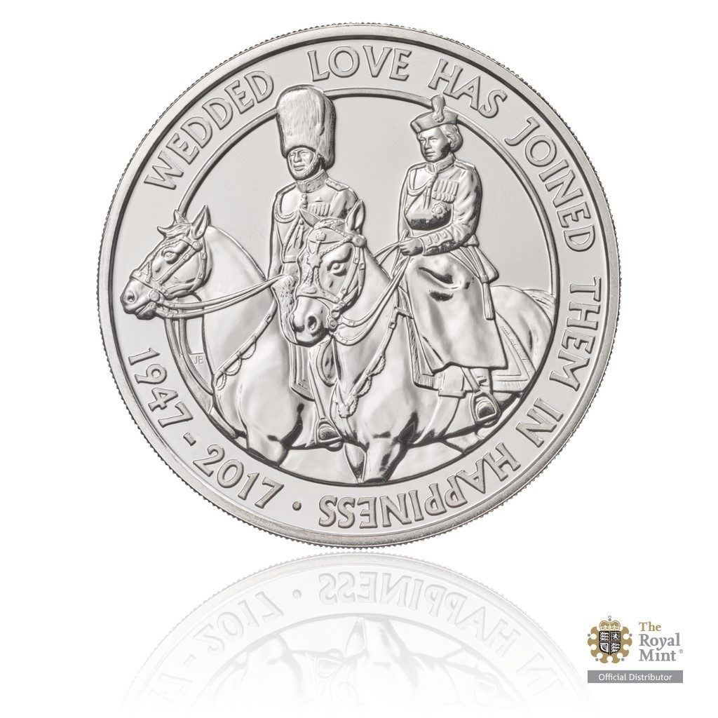 Averzní strana britské mince z dílny Etienna Millnera má unikátní podobu – nenese obvyklý samostatný portrét královny, ale dvojportrét páru. Reverz Johna Bergdahla je rovněž věnován královským manželům – tentokrát na jejich oblíbených koních při vojenské přehlídce.