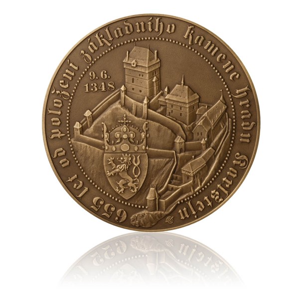 Majestátný hrad se tyčí nad třpytivou hladinou Berounky jako svědek nejkrásnějšího období v historii české země. Karlštejn nechal postavit Karel IV. jako klenotnici. Byly v něm uloženy korunovační klenoty Svaté říše římské a později i česká Svatováclavská koruna. Poklad byl umístěn v kapli sv. Kříže – nejkrásnější prostoře hradu, zdobené polodrahokamy, zlatem, hvězdami z benátského skla, pozlacenými řetězy a unikátní portrétovou galerií "veškerého vojska nebeského" starou více než půl tisíciletí. Na averzní straně medaile je pohled na hrad s korunovační korunou Karla IV., text v opisu 9. 6. 1348 je dnem položení základního kamene hradu. Reverz zobrazuje centrální pohled do kaple sv. Kříže na Karlštejně s pohledem na galerii deskových obrazů Mistra Theodorika. Vpravo postava Karla IV., která je volně převzata z nástěnné malby ostatkové scény z kostela Nanebevzetí P. Marie na Karlštejně. Vlevo od panovníka je umístěn líc a rub Zlaté buly Karla IV. Centrálně je umístěn podpisový monogram Karla IV. Limitovaná emise 500 kusů.
