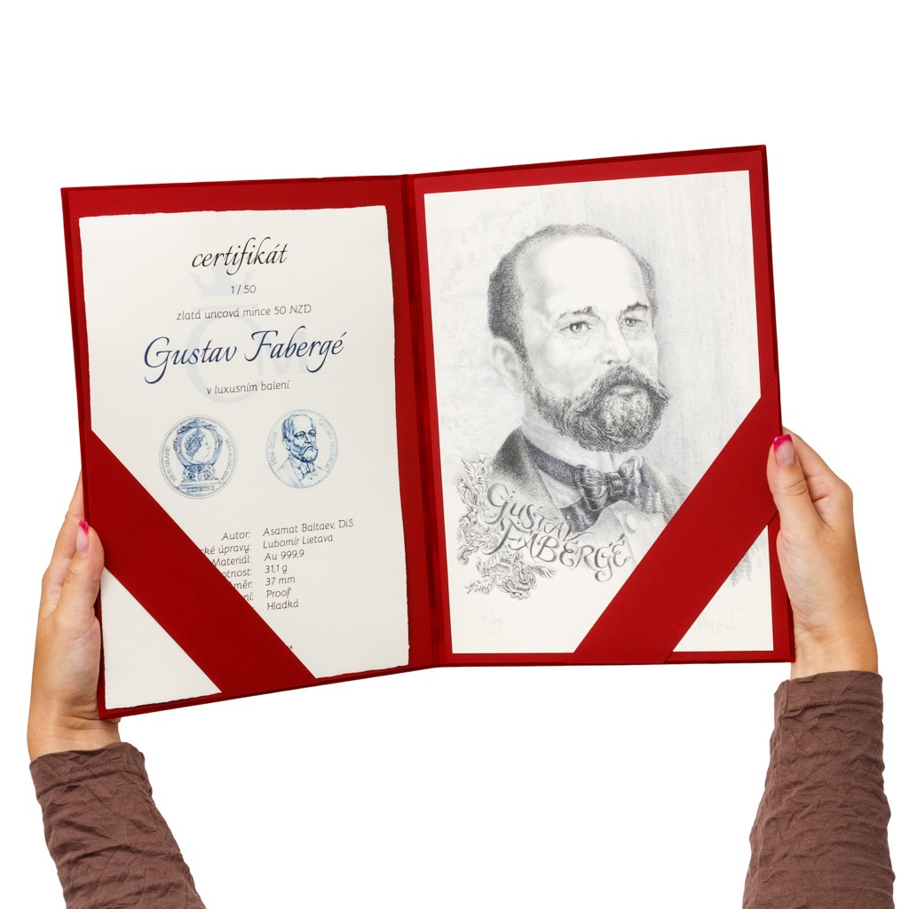 Emise zlatých půluncových mincí v luxusním obalu jsou doplněny sametovými deskami s certifikátem pravosti na ručně vyráběném papíře a litografickým listem s portrétem Gustava Fabergého. Originální tematické klenoty se zlatou uncovou mincí 50 NZD Gustav Fabergé jsou výjimečnou výzvou pro uváženou investici do umění. Odkaz trvalé hodnoty s noblesním motivem potěší každého milovníka výjimečné kvality a luxusu!