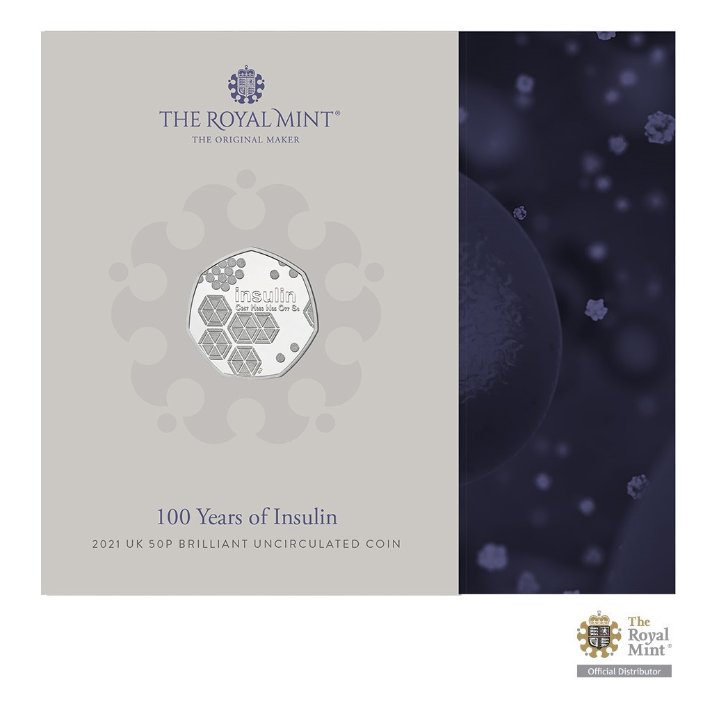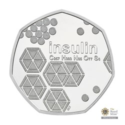 Reverzní strana mince, která je dílem výtvarnice Iris De La Torre, předkládá umělecké ztvárnění molekulární struktury inzulinu, které doprovází text INSULIN a příslušný chemický zápis léku. Averzní strana mince je pak věnována atributům emitenta – tj. portrétu královny Alžběty II., textu ELIZABETH II D G REG F D (Alžběta II., z Boží milosti královna, ochránkyně víry), nominální hodnotě 50 PENCE (GBP) a letopočtu emise 2021.