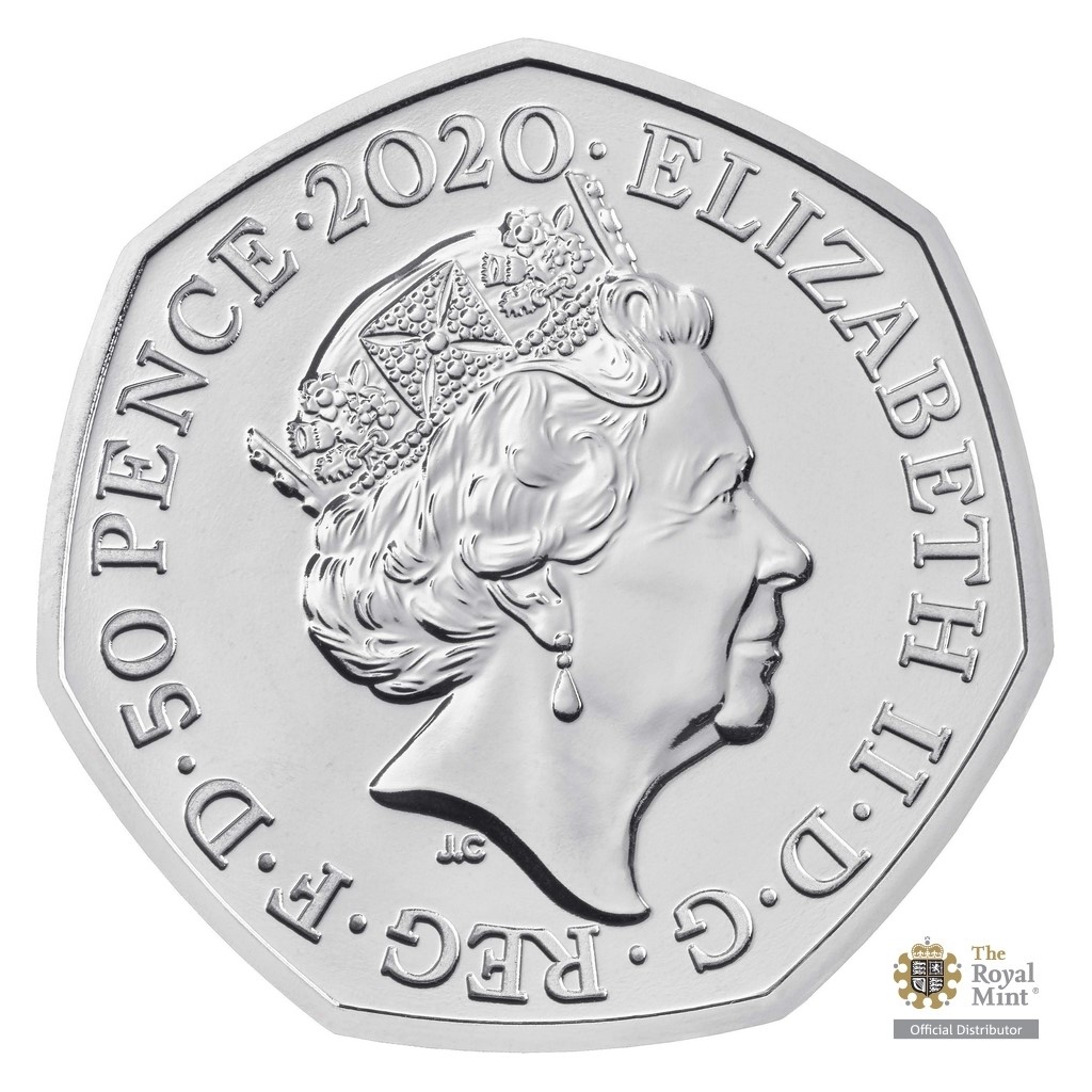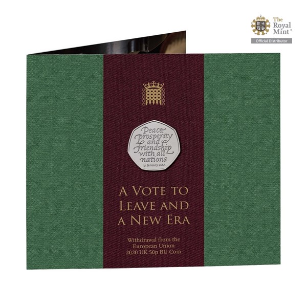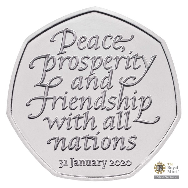 Strohá reverzní strana mince předkládá anglický nápis „PEACE, PROSPERITY AND FRIENDSHIP WITH ALL NATIONS“ (mír, prosperita a přátelství se všemi národy) doplněný správným datem Brexitu 31. ledna 2020. Averzní strana mince patří náležitostem emitenta – tj. nominální hodnotě 50 PENCE (GBP), profilu královny Alžběty II. a textu „ELIZABETH II D G REG F D“ (Alžběta II., z Boží milosti královna, ochránkyně víry).