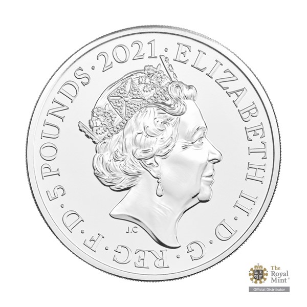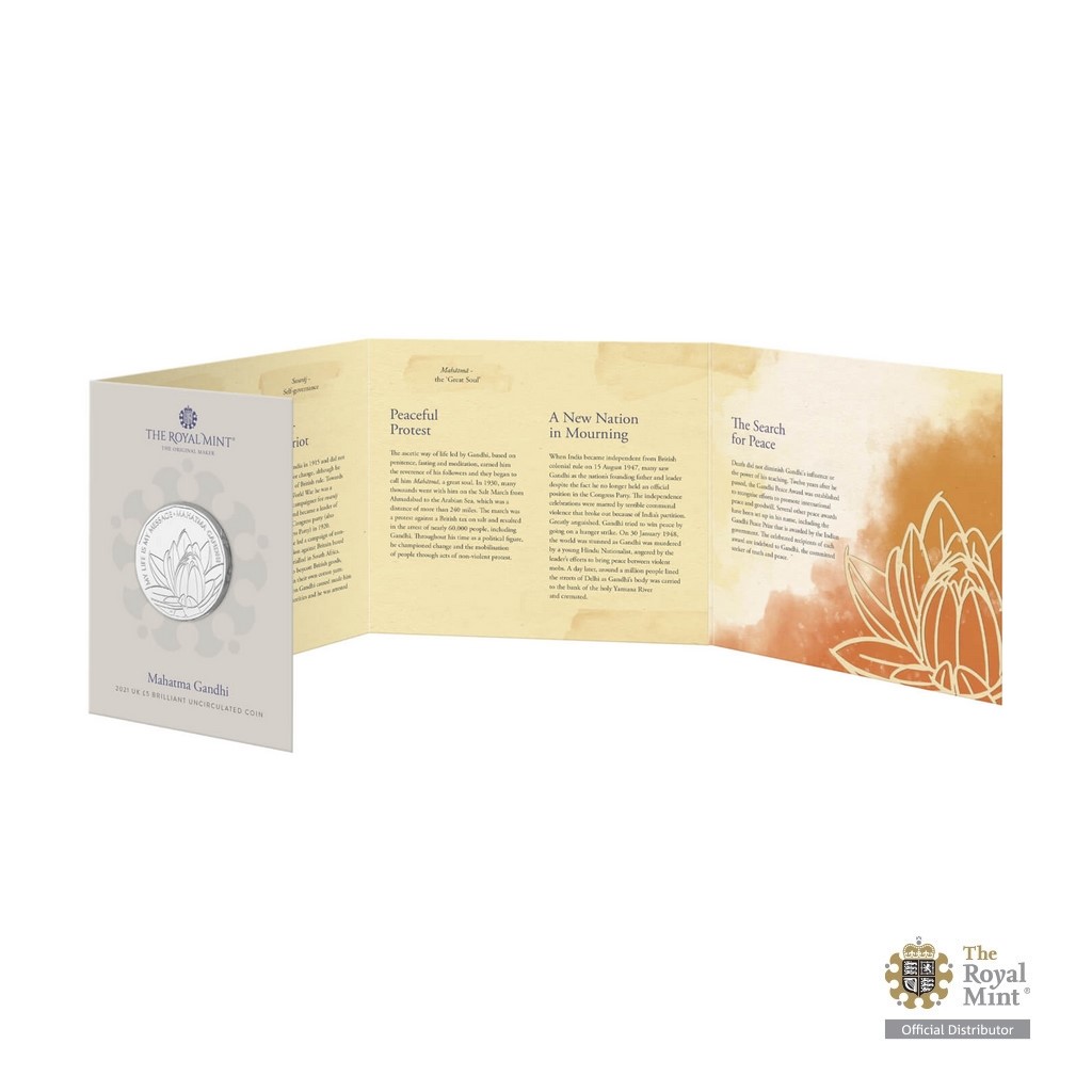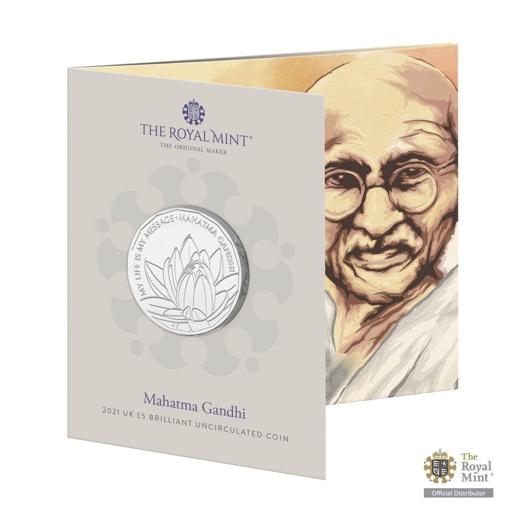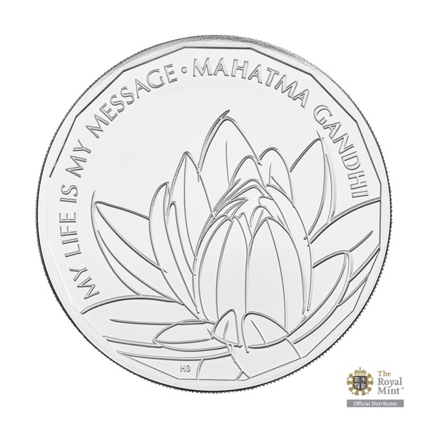 Reverzní strana mince předkládá květ lotosu, který symbolizuje jemnost a mírnost, ale zároveň sílu a schopnost růst navzdory nepřízni osudu. Výtvarnice s indickými kořeny Heena Gloverová doplnila indickou národní rostlinu jménem MAHATMA GANDHI a citátem MY LIFE IS MY MESSAGE (můj život je mým poselstvím). Averzní strana mince je věnována atributům emitenta – tj. portrétu královny Alžběty II., textu ELIZABETH II D G REG F D (Alžběta II., z Boží milosti královna, ochránkyně víry), letopočtu emise 2021 a nominální hodnotě 5 POUNDS (GBP).