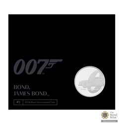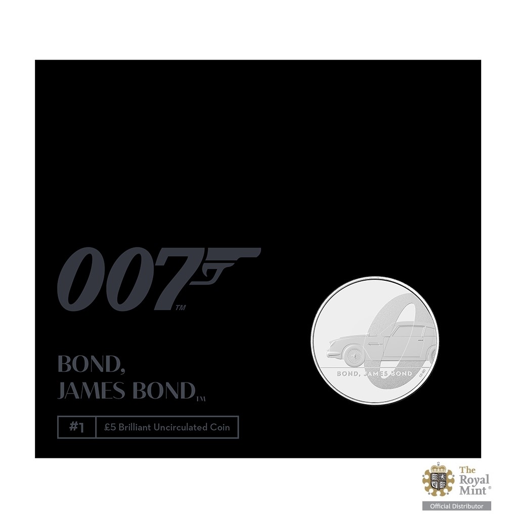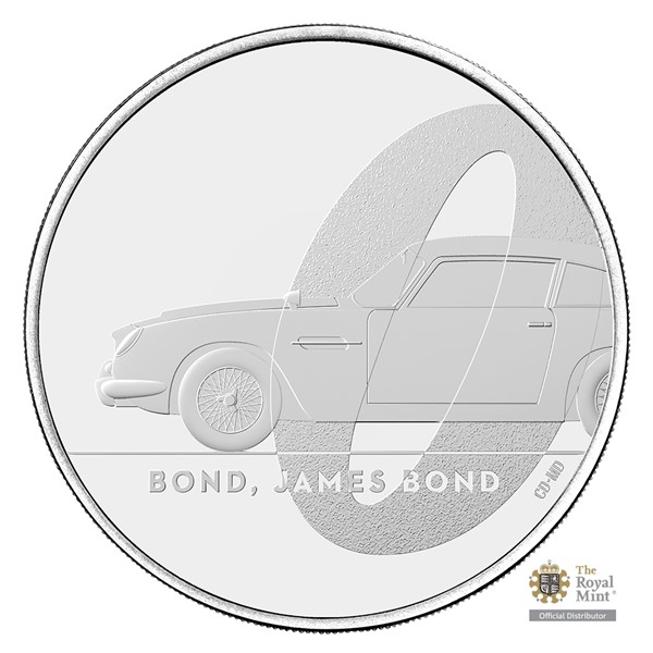 K postavě neohroženého špiona patří také fantastické vynálezy a rychlá auta. Ikonickou britskou značkou, která je s filmovými dobrodružstvími neodmyslitelně spjatá, je Aston Martin a na reverzní straně mince najdete model DB5. V reliéfu nechybí hláška „BOND, JAMES BOND“ a na pozadí se vyjímá část filmového loga 007. Kompletní logo odhalíte, když posbíráte všechny tři tematické mince z produkce britské mincovny The Royal Mint. Averzní strana ražby pak náleží atributům Velké Británie – tj. nominální hodnotě 5 POUNDS (GBP), portrétu královny Alžběty II. a textu „ELIZABETH II D G REG F D“ (Alžběta II., z Boží milosti královna, ochránkyně víry).