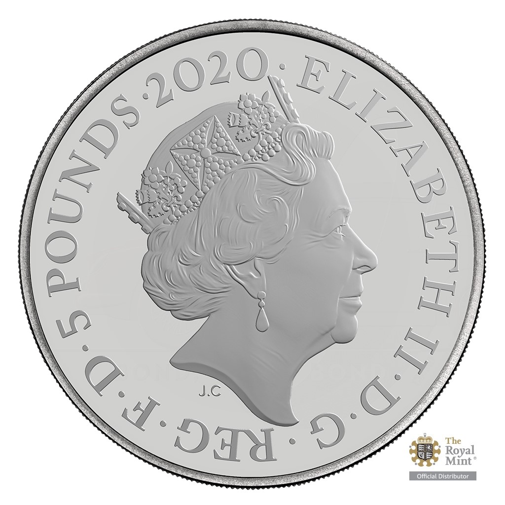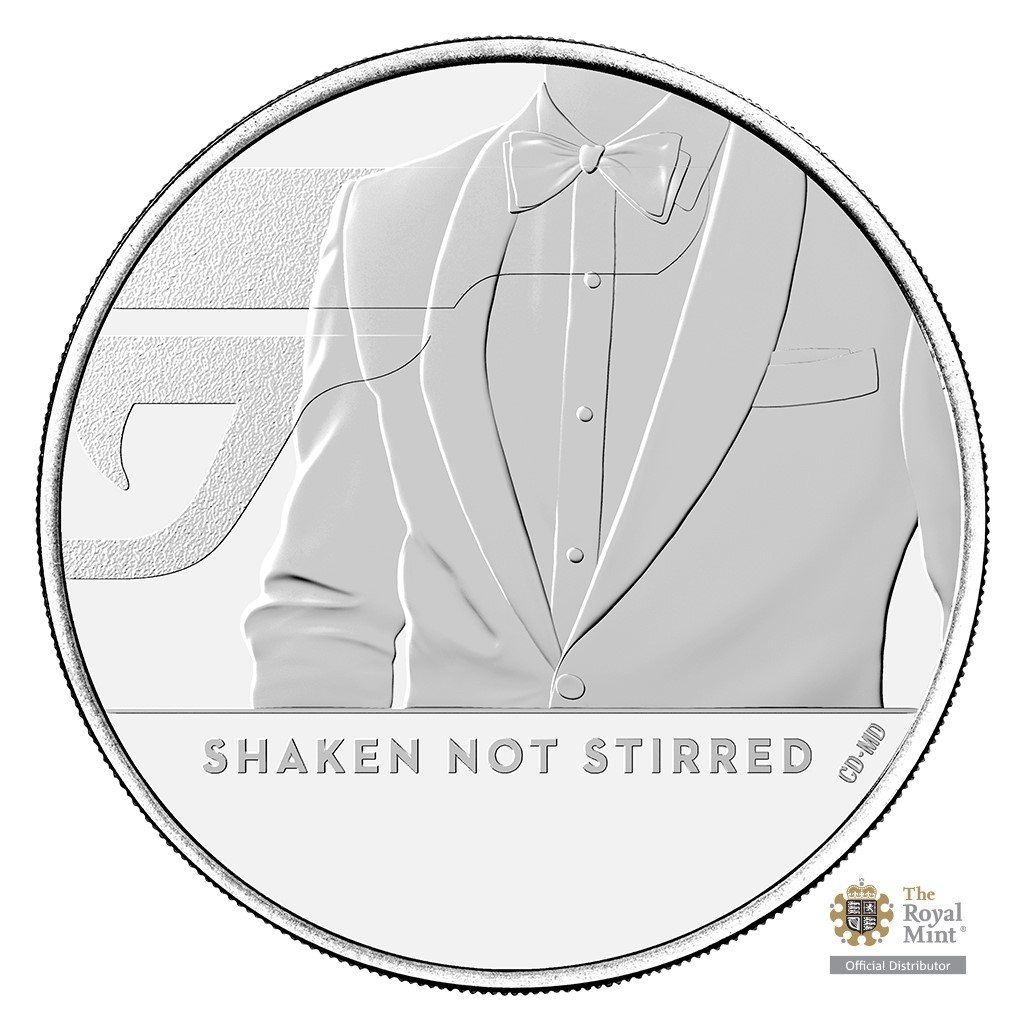 Reverzní straně mince vévodí torzo špiona ve smokinku s motýlkem – jeho tvář není vidět, aby si každý fanoušek bondovek mohl představit svého oblíbeného herce. V reliéfu nechybí hláška „SHAKEN NOT STIRRED“ a na pozadí se vyjímá část filmového loga 007. Kompletní logo odhalíte, když posbíráte všechny tři tematické mince z produkce britské mincovny The Royal Mint. Averzní strana ražby pak náleží atributům Velké Británie – tj. nominální hodnotě 5 POUNDS (GBP), portrétu královny Alžběty II. a textu „ELIZABETH II D G REG F D“ (Alžběta II., z Boží milosti královna, ochránkyně víry).