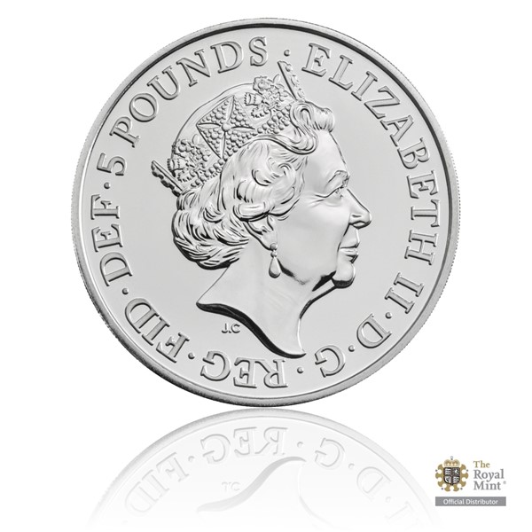 Na reverzní straně mince vyobrazil designér Jody Clark erbovního sokola, a to hned dvakrát. První dravec drží v pařátech štít, který předkládá druhého dravce sedícího na otevřeném visacím zámku. Averzní strana mince náleží atributům emitenta – tj. nominální hodnotě 5 POUNDS (GBP), portrétu královny Alžběty II. a textu „ELIZABETH II D G REG FID DEF“ (Alžběta II., z Boží milosti královna, ochránkyně víry).
