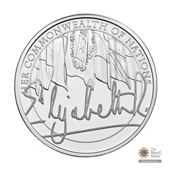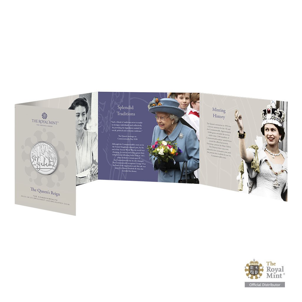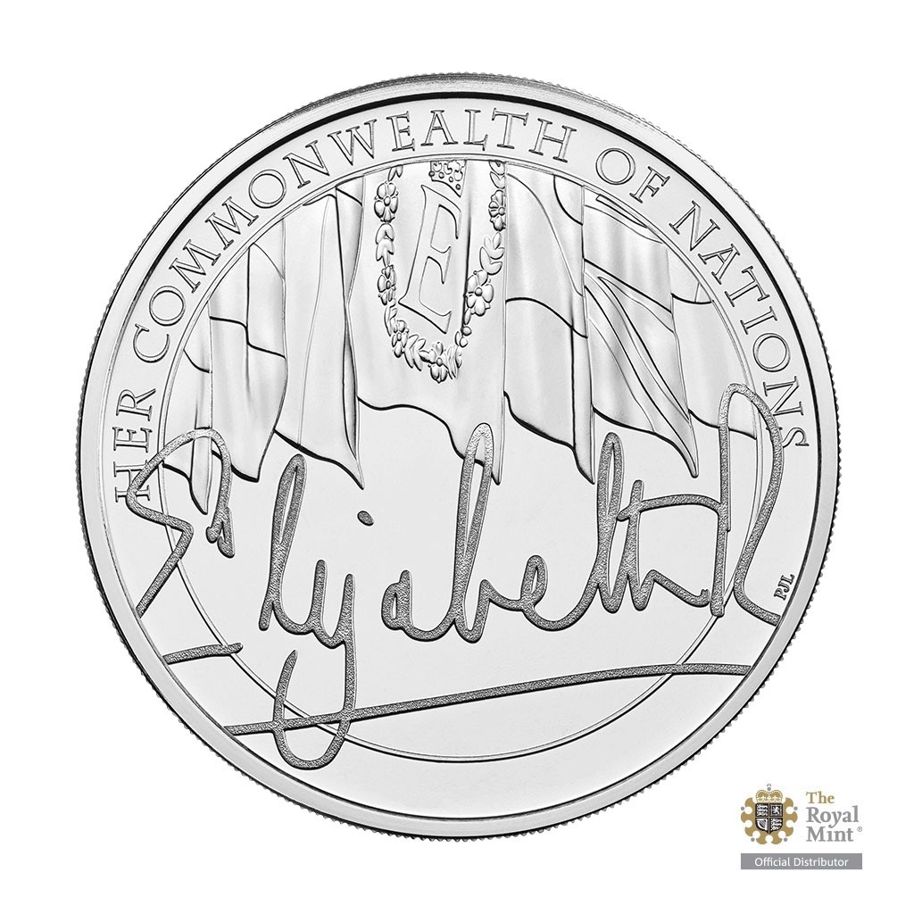 Irský výtvarník P. J. Lynch věnoval reverzní stranu mince řadě vlajek, které symbolizují Commonwealth. Mezi vlajkami vybraných státu se vyjímá osobní vlajka Alžběty II. s královniným monogramem. Doplňkovým motivem reverzu je královnin podpis, který se na mincích objevuje vůbec poprvé. Averzní strana je pak věnována atributům emitenta – tj. portrétu královny Alžběty II., textu ELIZABETH II D G REG F D (Alžběta II., z Boží milosti královna, ochránkyně víry), letopočtu 2022 a nominální hodnotě 5 POUNDS (GBP).