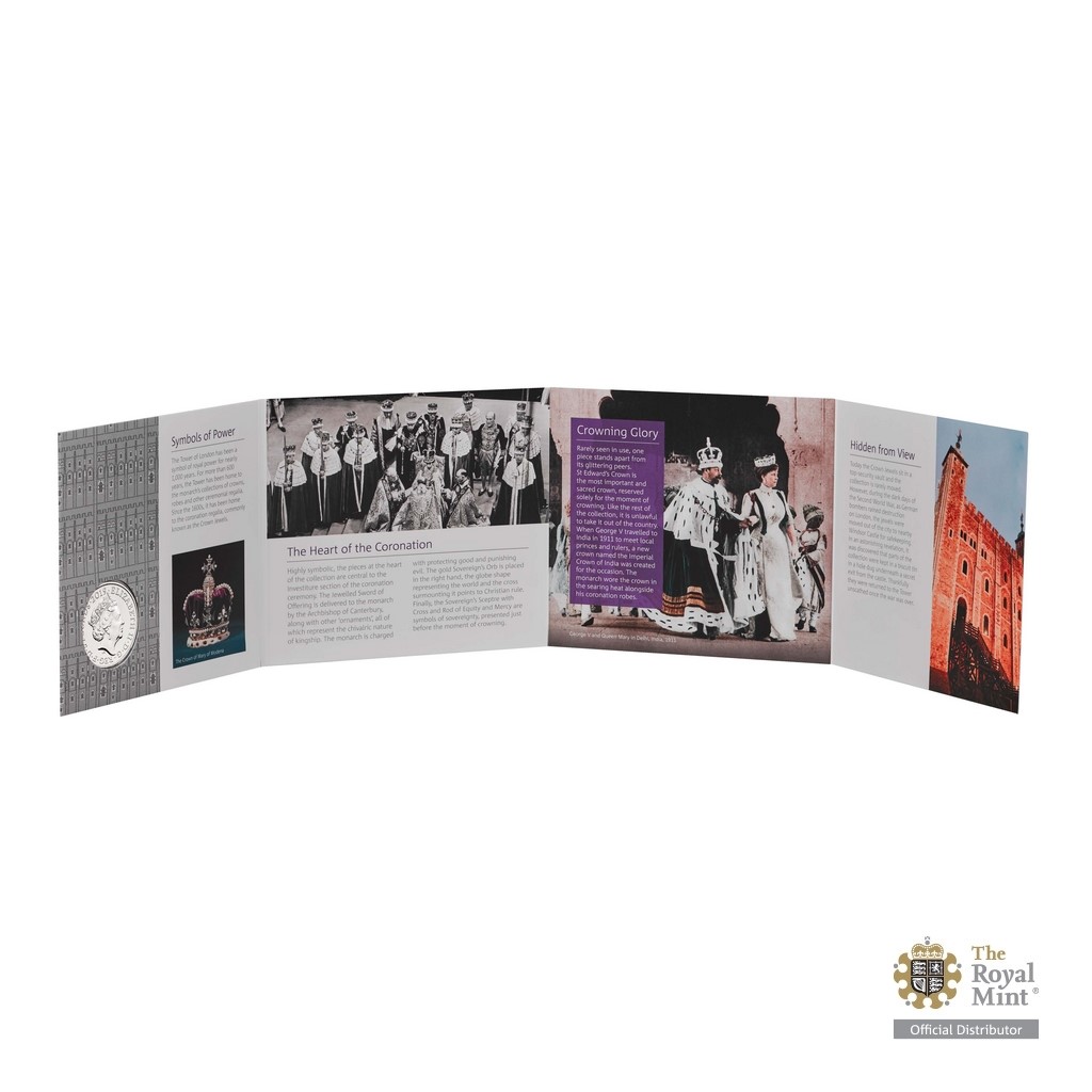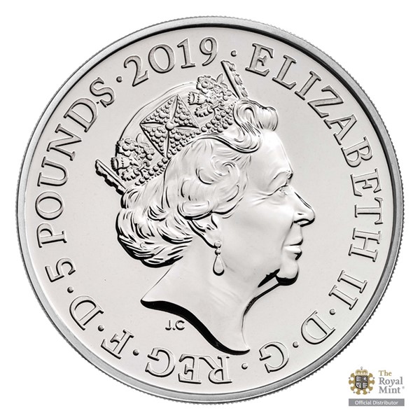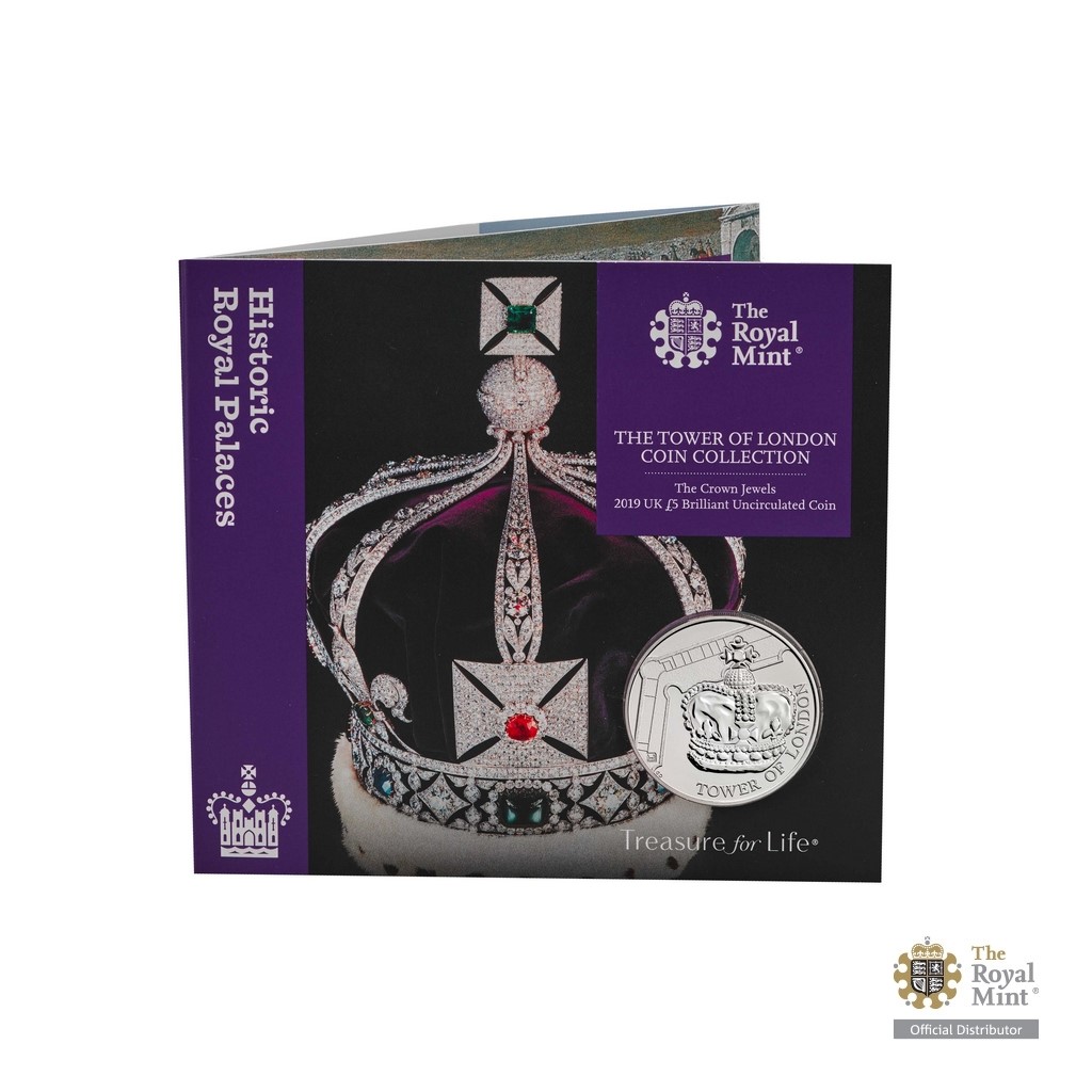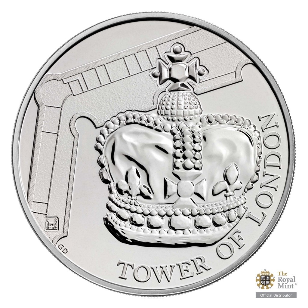 Reverzní strana mince předkládá jednu z mnoha britských korun – konkrétně korunu Marie z Modeny – a část půdorysu Toweru. Averzní strana pak nese nominální hodnotu 5 POUNDS (GBP), portrét královny Alžběty II., opis „ELIZABETH II D G REG F D“ (Alžběta II., z Boží milosti královna, ochránkyně víry) a ročník emise 2019.