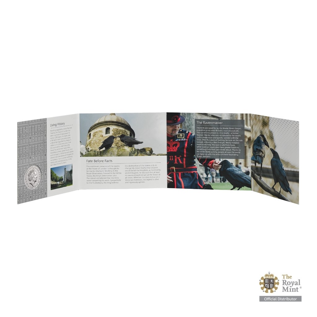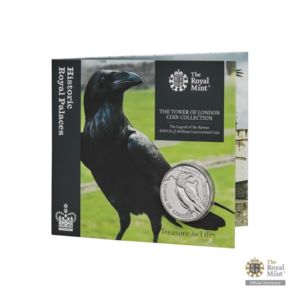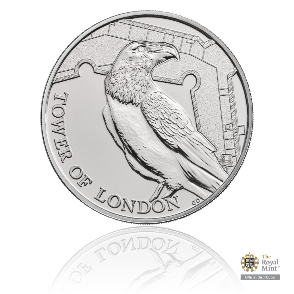 Reverzní strana mince předkládá nejen krkavce, ale také část půdorysu Toweru. Tento prvek je společný všem čtyřem mincím minisérie. Averzní strana pak nese nominální hodnotu 5 POUNDS (GBP), profil královny Alžběty II., opis „ELIZABETH II D G REG F D“ (Alžběta II., z Boží milosti královna, ochránkyně víry) a ročník emise 2019.