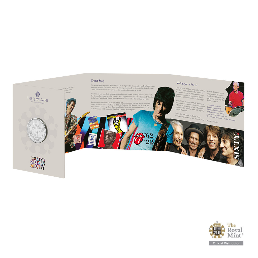 Pátou legendou britské populární hudby, která se objevuje na pamětních mincích ze sběratelského cyklu královské mincovny The Royal Mint, jsou The Rolling Stones.