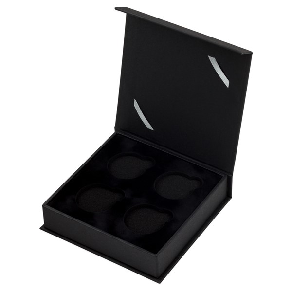 Krabička z pevného papíru s magnetickým uzavíráním pojme 4 kusy zlatých nebo stříbrných mincí České mincovny o hmotnosti 1 trojské unce.