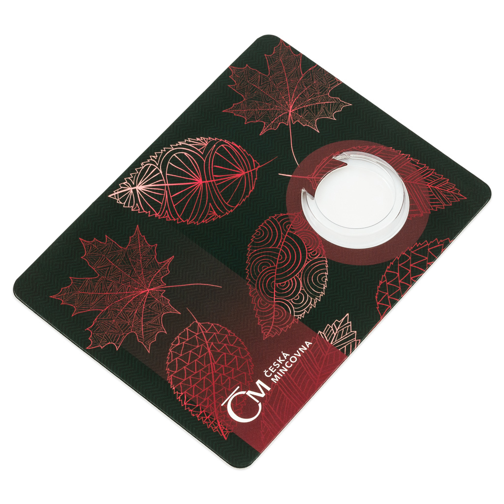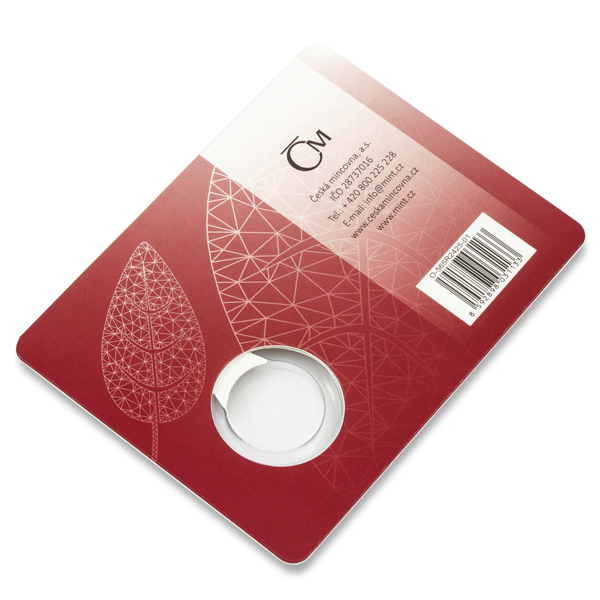 Do karty z pevného papíru, která je ozdobena decentním motivem listů, je vsazeno lůžko tvarované tak, aby pojmulo následující mince či medaile: