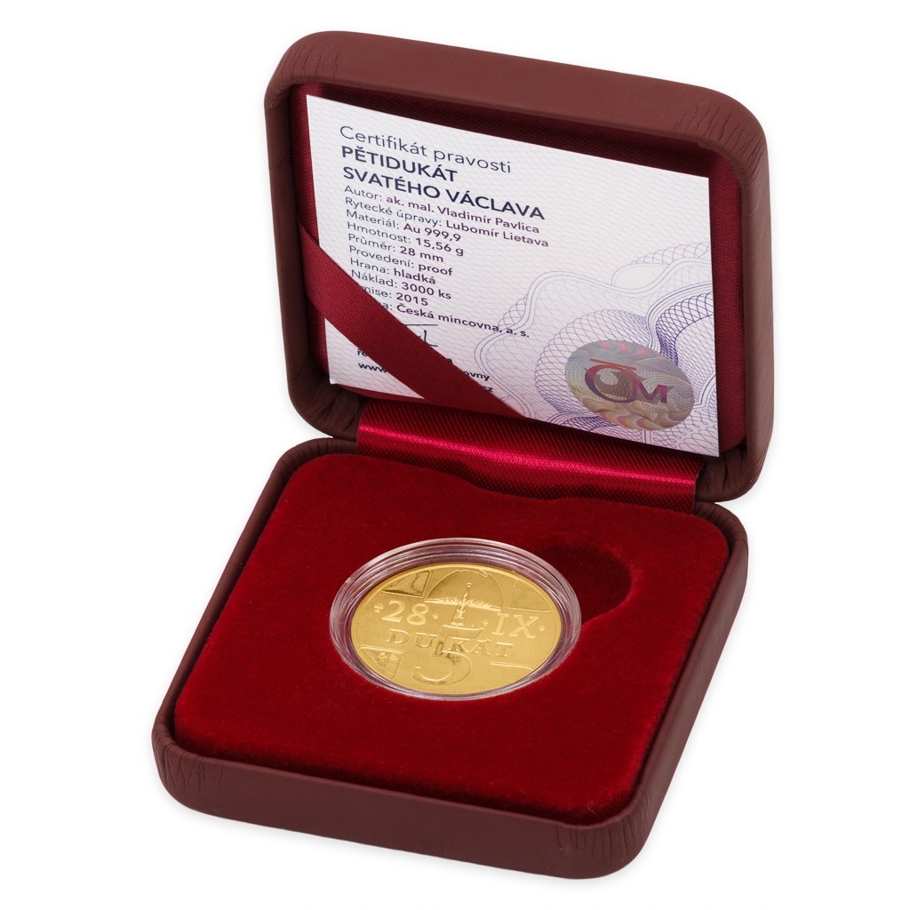 Díky charismatickému výtvarnému zpracování akademického malíře Vladimíra Pavlici má pětidukát svatého Václava ambice zařadit se na čelní místa ražeb s touto velkolepou tématikou. Averz zdobí motiv kříže, v němž je umístěna plastika svatováclavská přilbice. Výjev doplňují texty 28. IX. a 5DUKÁT. Reverz zdobí rovněž reliéf kříže, v jehož centru je umístěn nádherný portrét světce spolu s nápisem Sv. Václav. Nenechte si tento luxusní sběratelský kousek s vysokou investiční hodnotou uniknout!