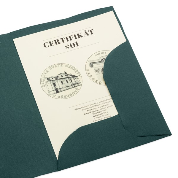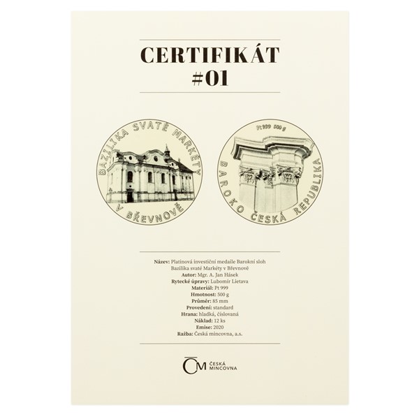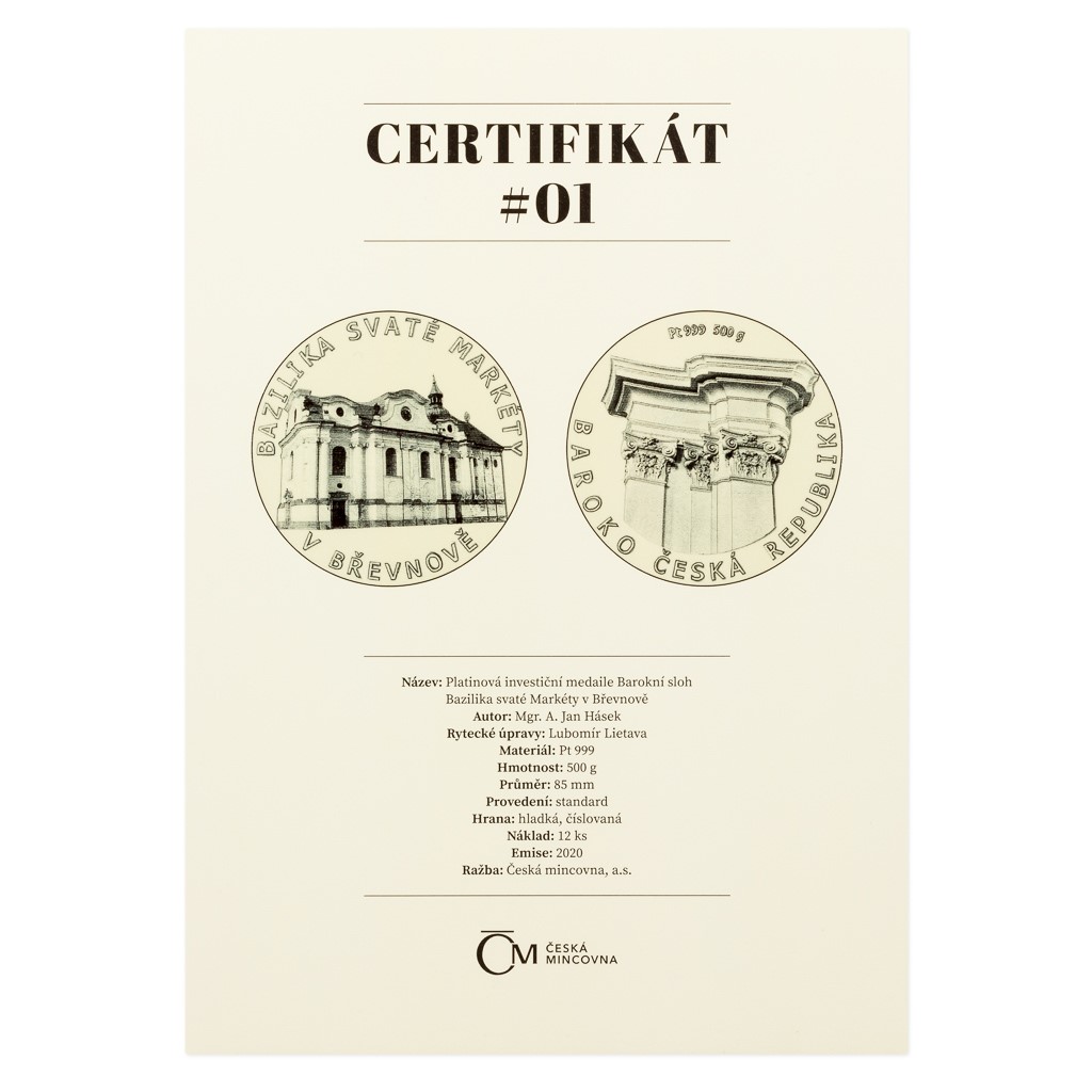 Po románském, gotickém a renesančním umění se na půlkilogramových platinových medailích České mincovny objevuje baroko, které celý cyklus věnovaný architektonickým slohům uzavírá.