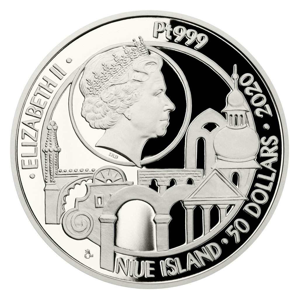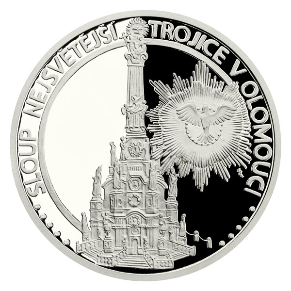 Reverzní straně mince dominuje pohled na morový sloup v celé jeho kráse. „Doplňujícím prvkem je vyobrazení detailu z vrcholového sousoší Nejsvětější Trojice. Je jím holubice – čili Duch Svatý,“ vysvětluje autorka mince Lenka Nebeská, DiS. Kompozici obklopuje perlovec a opis SLOUP NEJSVĚTĚJŠÍ TROJICE V OLOMOUCI. Averzní straně mince, která je společná celé platinové sérii, vévodí koláž složená z architektonických prvků rozličných českých staveb zapsaných na Seznamu světového dědictví UNESCO. Protože mince České mincovny vycházejí v licenci zahraničního emitenta, kterým je ostrov Niue, nese averz ještě jeho nezbytné atributy – nominální hodnotu 50 DOLLARS (NZD), jméno a portrét královny Alžběty II. a rok emise 2020.
