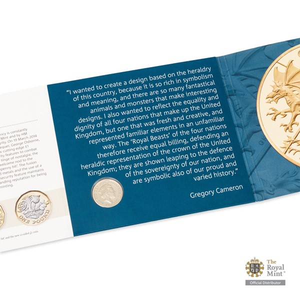 Averzní strana mince zachycuje heraldická zvířata v podání anglikánského biskupa Gregoryho Camerona. Každé z jeho mytických zvířat reprezentuje jeden z národů ostrovního království – po směru hodinových ručiček reliéf předkládá anglického lva, skotského jednorožce, severoirského jelena a velšského draka. „Prostřednictvím zvířat, která chrání suverenitu Británie, jsem chtěl vyjádřit její jednotu,“ říká autor, který na reverz umístil ještě královskou korunu a nominální hodnotu ONE POUND. Averzní strana mince pak nese portrét královny Alžběty II. obklopený opisem „ELIZABETH II DEI GRA REG FID DEF“ (Alžběta II., z Boží milosti královna, ochránkyně víry) a ročníkem emise 2016.