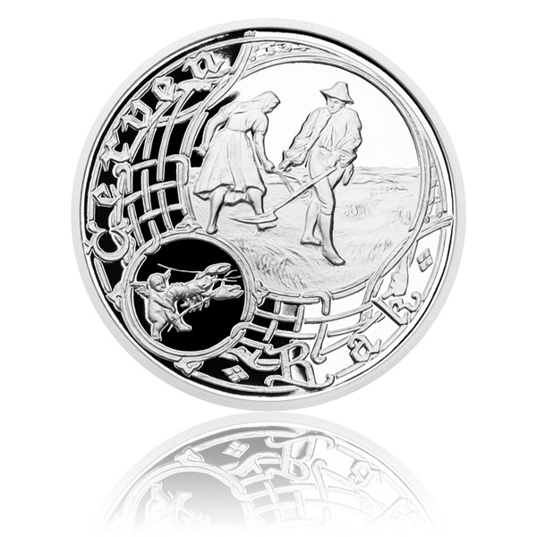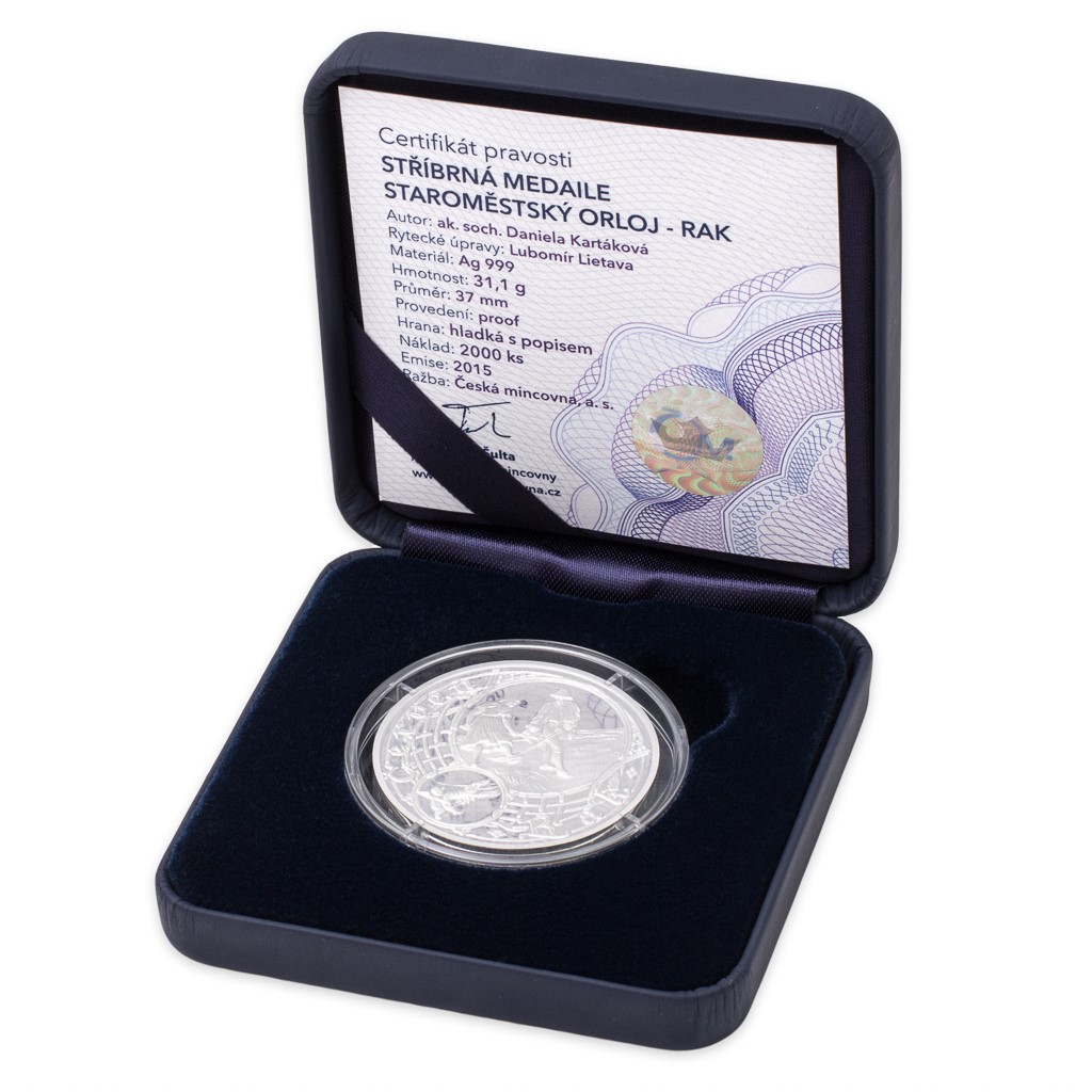 Série Staroměstský orloj od České mincovny se dočkala dalšího krásného přírůstku – postříbřené medaile věnované letnímu znamení Raka. To je na astronomické desce orloje, jejímž autorem je významný český malíř Josef Mánes, doplněno nádherným letním motivem žence s kosou a dívky hrabající trávu. Půvabný námět převedla do podoby medaile akademická sochařka Daniela Kartáková, která vyzdobila averz oběma Mánesovými medailony vztahujícími se k měsíci červnu. Reverzu pak dominuje sám Josef Mánes s paletou v ruce v popředí celé astronomické desky.