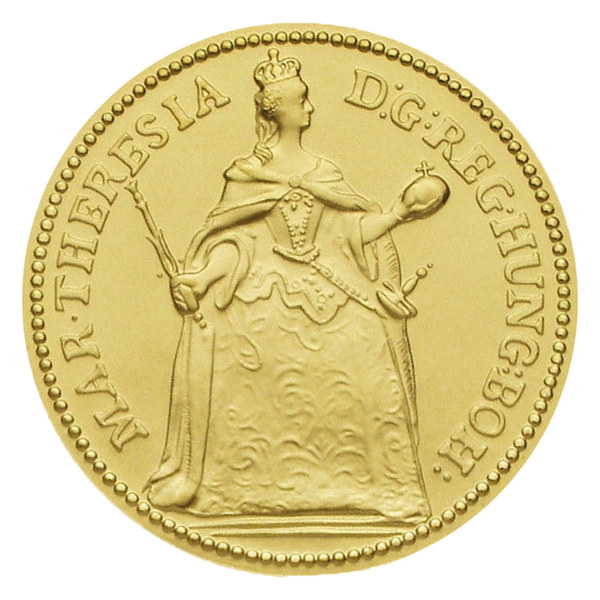 Výlučný dukát jediné vládnoucí české královny Marie Terezie, dcera a dědička císaře Karla VI.; vládkyně habsburského panství, česká a uherská královna, rakouská arcivévodkyně, nastoupila na trůn po smrti svého otce na základě tzv. pragmatické sankce. Přesto vzápětí okolní panovníci neuznali její dědické nároky a vystoupili proti ní. Karel Albrecht Bavorský vznesl nárok na Čechy a rakouské země, Fridrich II. Pruský na Slezsko a Fridrich August II. Saský na Moravu. Obratnou politikou a shodou politických okolností se Marii Terezii podařilo zachránit většinu svého dědictví. Jedinou významnou ztrátou bylo odtržení větší části Slezska od české koruny. Neutěšený stav ekonomiky a financí přivedl Marii Terezii k zavedení první měděné mince (pro české země grešle a krejcary) a o něco později i prvních papírových peněz (tzv. bankocetlí). Jednalo se o první kreditní peníze v českých zemích. Reforma mincovního systému se ražby dukátů nedotkla. Dukát Marie Terezie jako jediný mezi českými zlatými ražbami vyobrazuje postavu ženy – královny.